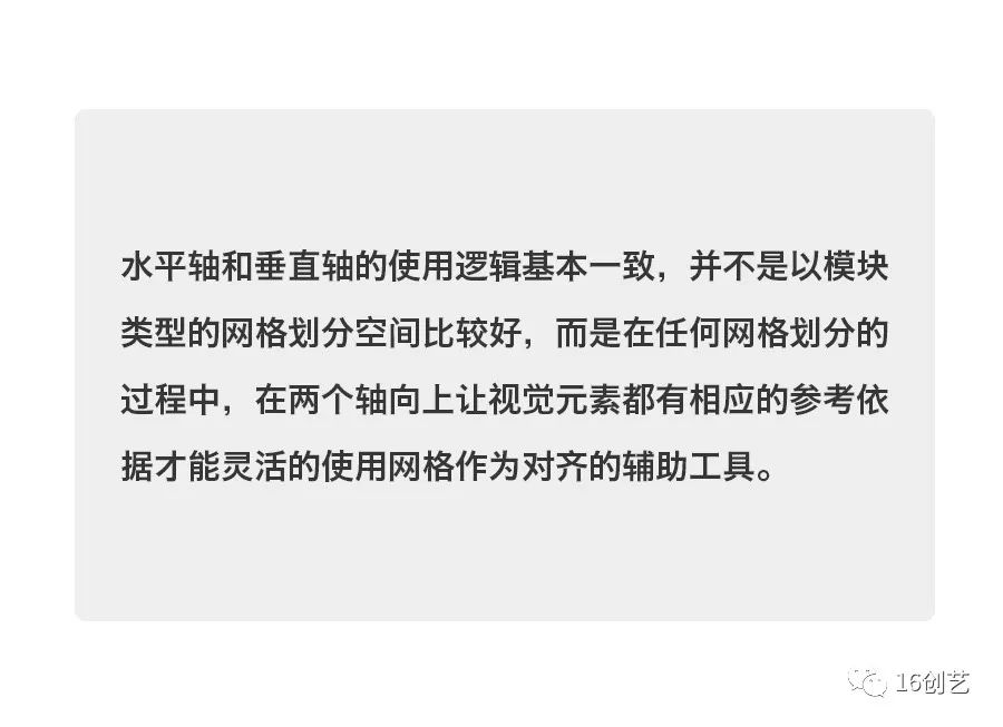 在常规的编排情况下,不管什么样的画布都会率先以垂直的方式对版面进行划分,而水平轴则是以中心轴为基础来权衡版面的平衡,其他视觉元素的水平方向会以看起来舒适的方式区分层级,看起来是使用了相应的网格对空间进行较为合理的划分,殊不知版面中的视觉元素只是贴合了单向轴,而并没有在另外一个轴向上对空间进行合理的安排,即使是栏划分也需要考虑两个轴向。