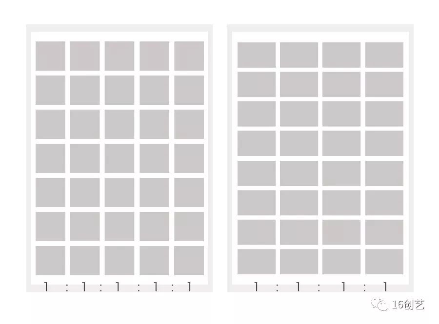 即使以不同类型的网格划分版面空间也可以看出,当对空间进行平均划分时依旧存在等比关系,即使是以不同大小的形状、多少等这种关系始终是没有发生任何变化,并不受制于网格的类型和划分的大小多少,变化的只是形式,而在进行编排时我们要使用的即是这种不变的等比逻辑关系为视觉元素建立相应的关系。