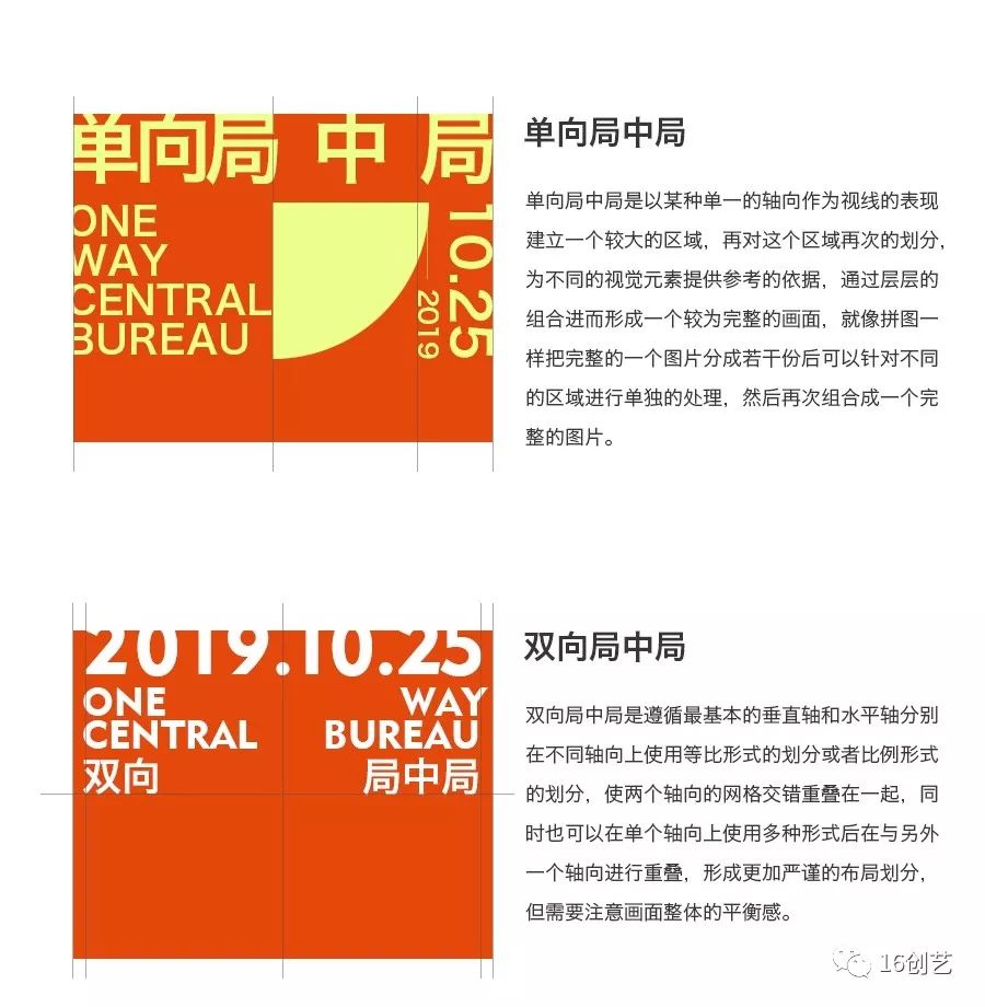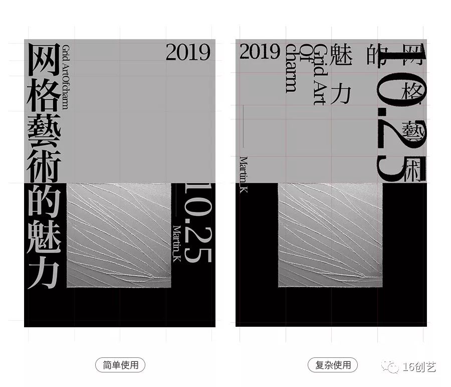 在相同的网格分割下以不同的编排布局可以看出,想要灵活的使用网格系统编排好版面的视觉元素,并不是取决于网格的划分类型,而是在于网格的逻辑和规律使用,水平轴是在除了以中心轴与人眼观看事物的水平线以外的轴线,是需要通过视觉元素的起始点和结束点以及网格的辅助权衡版面视觉平衡的重要依据。