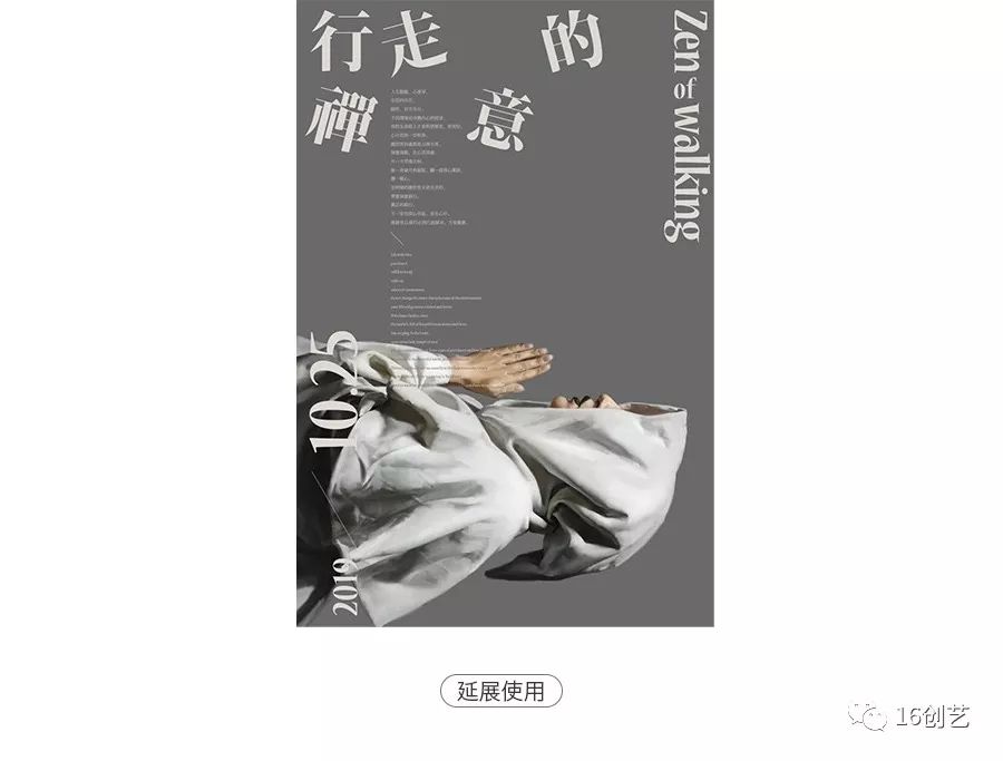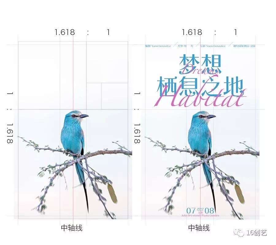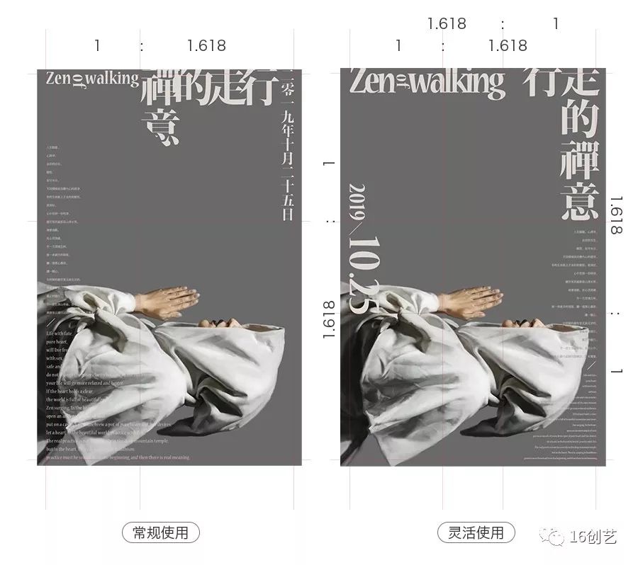然后把其他信息植入到画面当中以贴合黄金比例的空间划分,同时又针对文字信息的层级进行三分法的等比划分,在满足于整体的网格划分下也产生了自身的网格,使黄金分割中包涵三分法的形式,并把黄金分割时左右产生的边距运用到信息与信息的层级之间形成一定的间距,在贴合网格框架的同时也与主体很好的融为一体。
