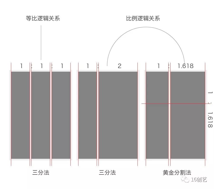 不管在任何的版面空间中,当以垂直中心轴或者是水平中心轴衡量版面平衡时,空间是以某个中心轴向为基础一分为二形成等比的划分,而我们要使用的就是这种等比划分的逻辑关系,不管是把空间划分层多少份,只要是平均划分的情况下这种逻辑关系都存在。