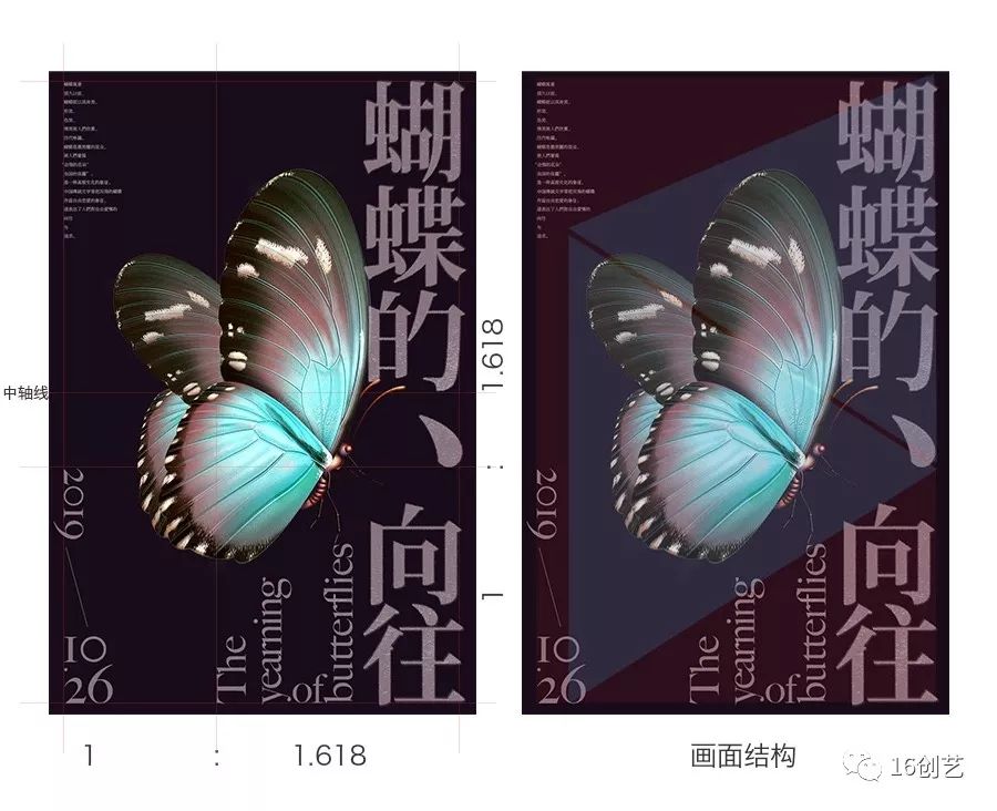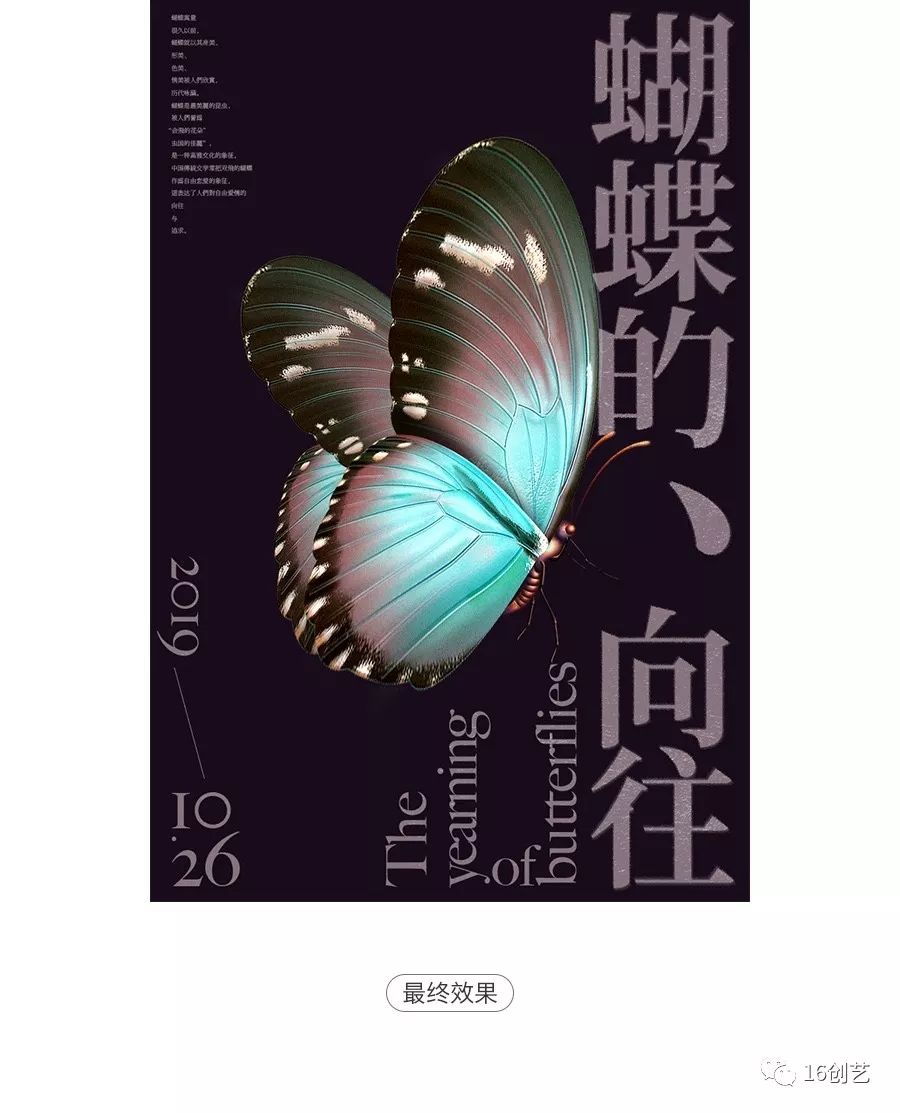 当把所有的信息置入到版面中后需要根据主体的表现使其他的信息适当的贴合网格布局,不管使用什么样的创意组合以及效果,尽可能的保证画面的整体性,文字信息依据比例的分布调整大小和间距在贴合主体形态的情况下传递出一种蝴蝶要着落的感觉,而文字信息发挥的作用就是主体的着落点,即贴合网格部分又与主体形成结构。