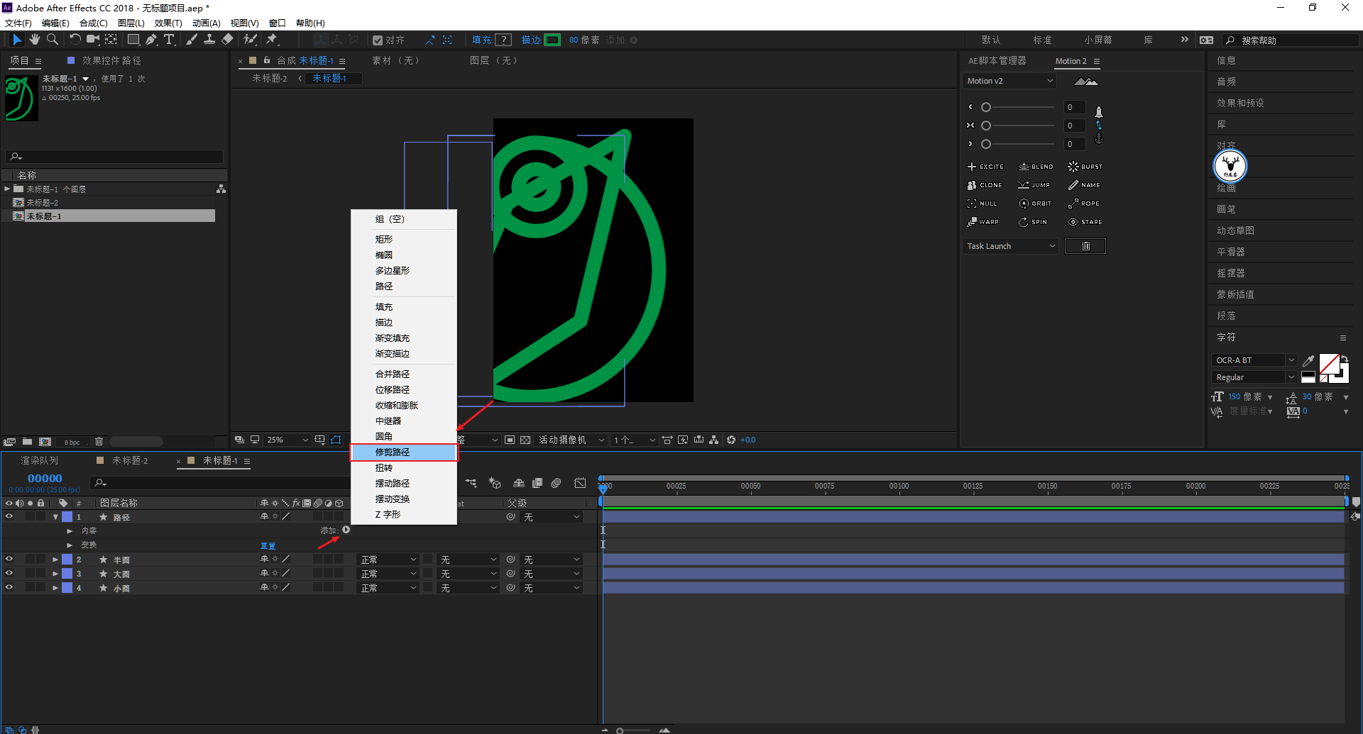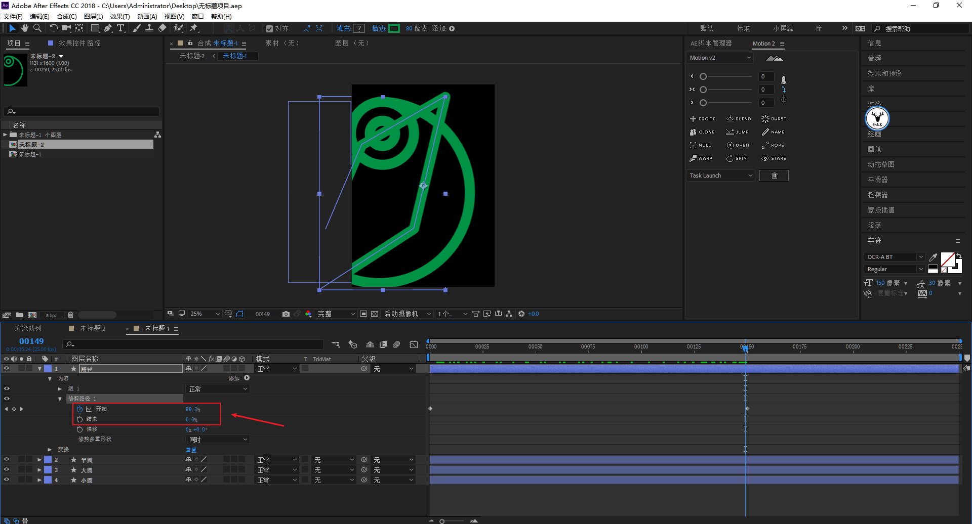 下面就是做路径动画了,我以其中一个路径为例,展开属性,在内容里点击小三角添加修剪路径: