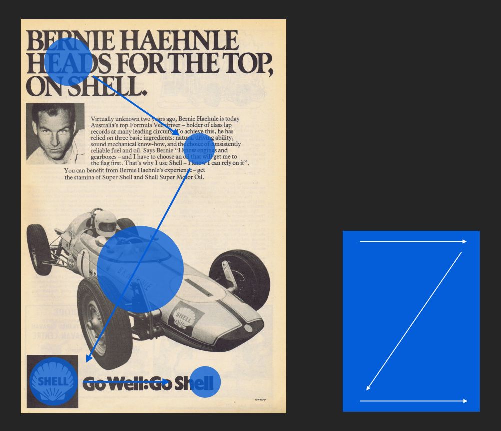 这张壳牌广告是Z模式结构,人的视线先被图片所吸引,然后是从左到右,从上到下阅读。