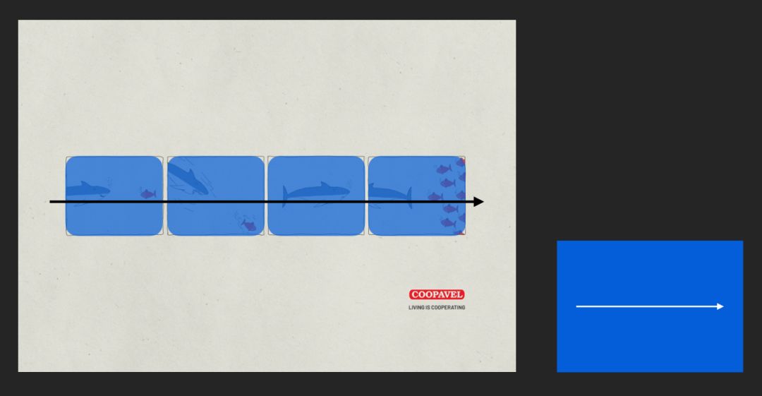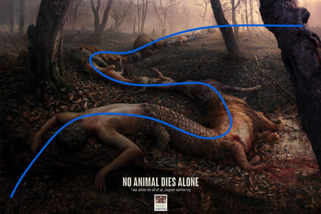 这张广告明显能看出这个动势了,由近到远以蜿蜒的方式移动,野生动物狩猎每天仍在泰国发生,这个广告通过展示失去一种野生动物,如何影响另一种野生动物,来建立对狩猎问题的认识。