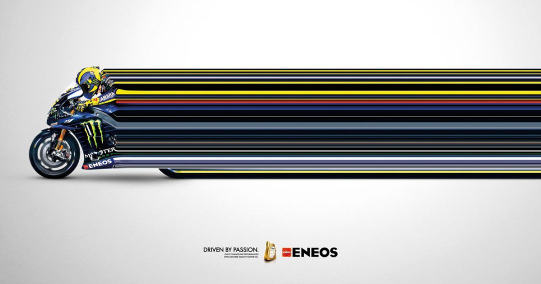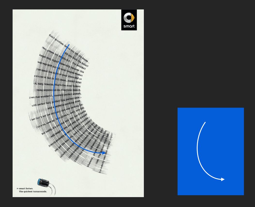 这个广告的阅读动向是偏弧线的,首先视线会在英文做的图形上停留,模拟了漂移的效果,然后移动到左下角的汽车,同样也是漂移的弧线,有一个很好的呼应。