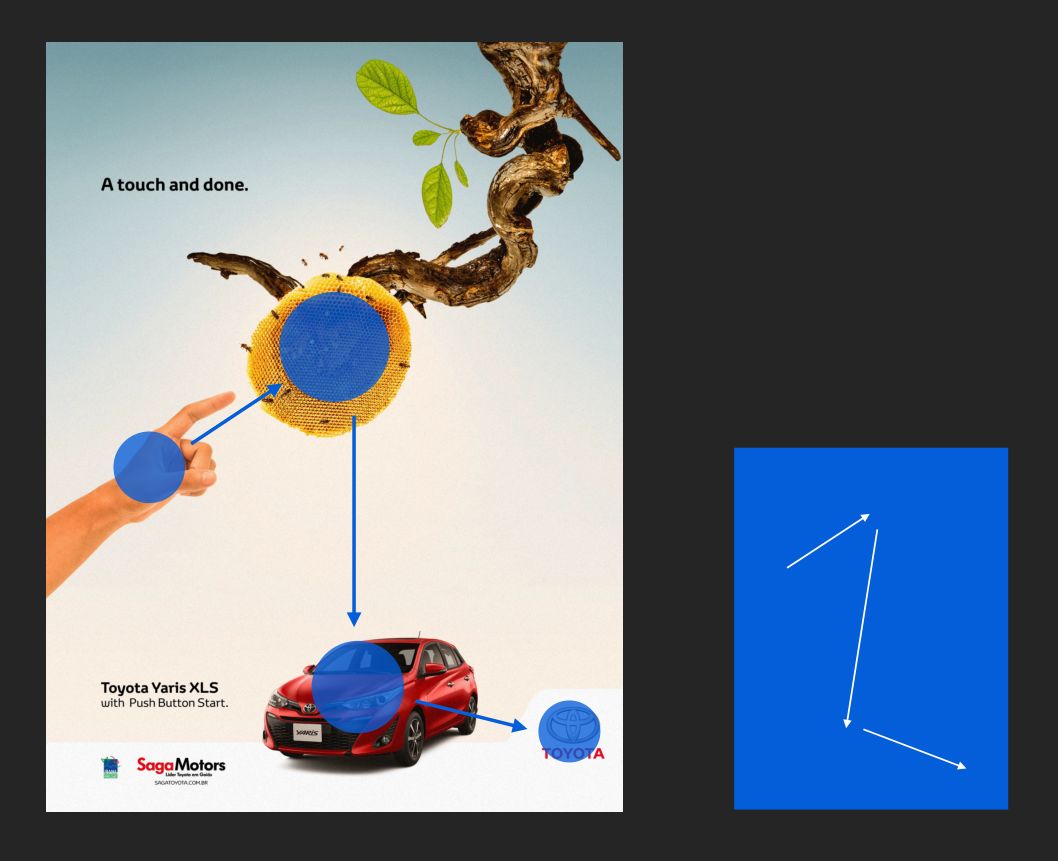 这张和Z模式的趋势是一样的,视线先被手吸引,顺着手指方向,移到蜂窝,然后落在汽车上,最后视线会落到丰田的logo上。广告说的是丰田这款车一触即发,图像和文案紧密联系,把手触蜂窝那一瞬间发生的事转移到产品上,充满了趣味性。