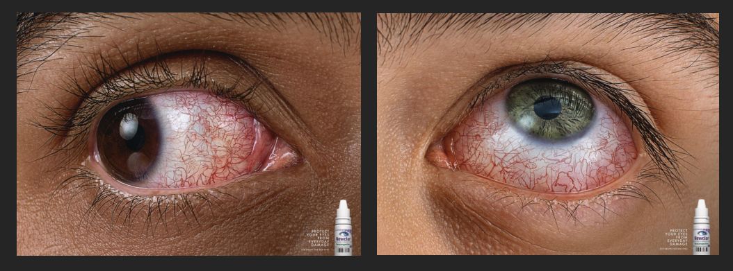 而这张是近期的一张创意广告,也有异曲同工之处,用布满红色血丝的眼球表现平时伤害眼睛的活动。