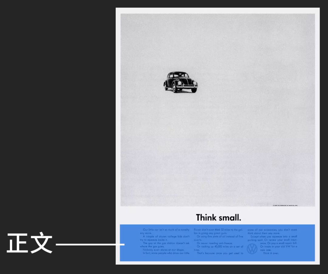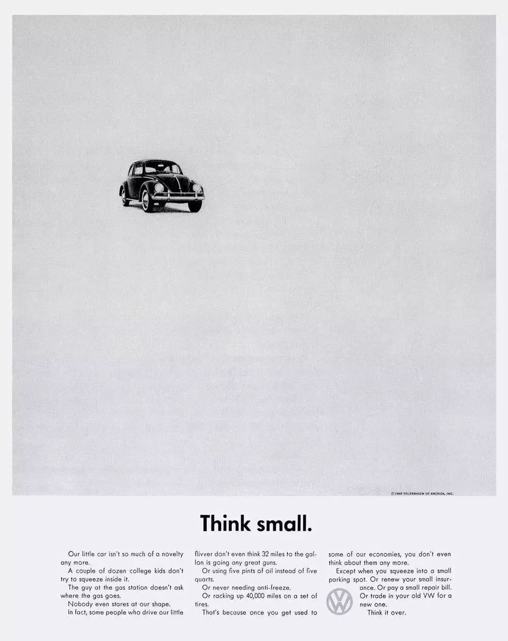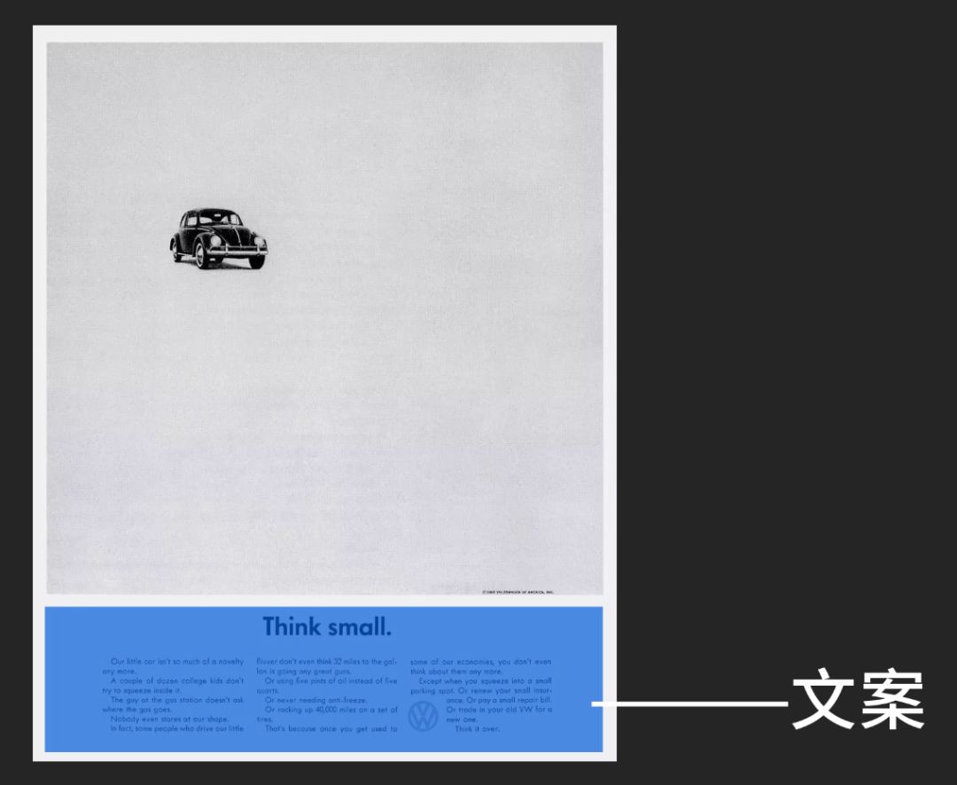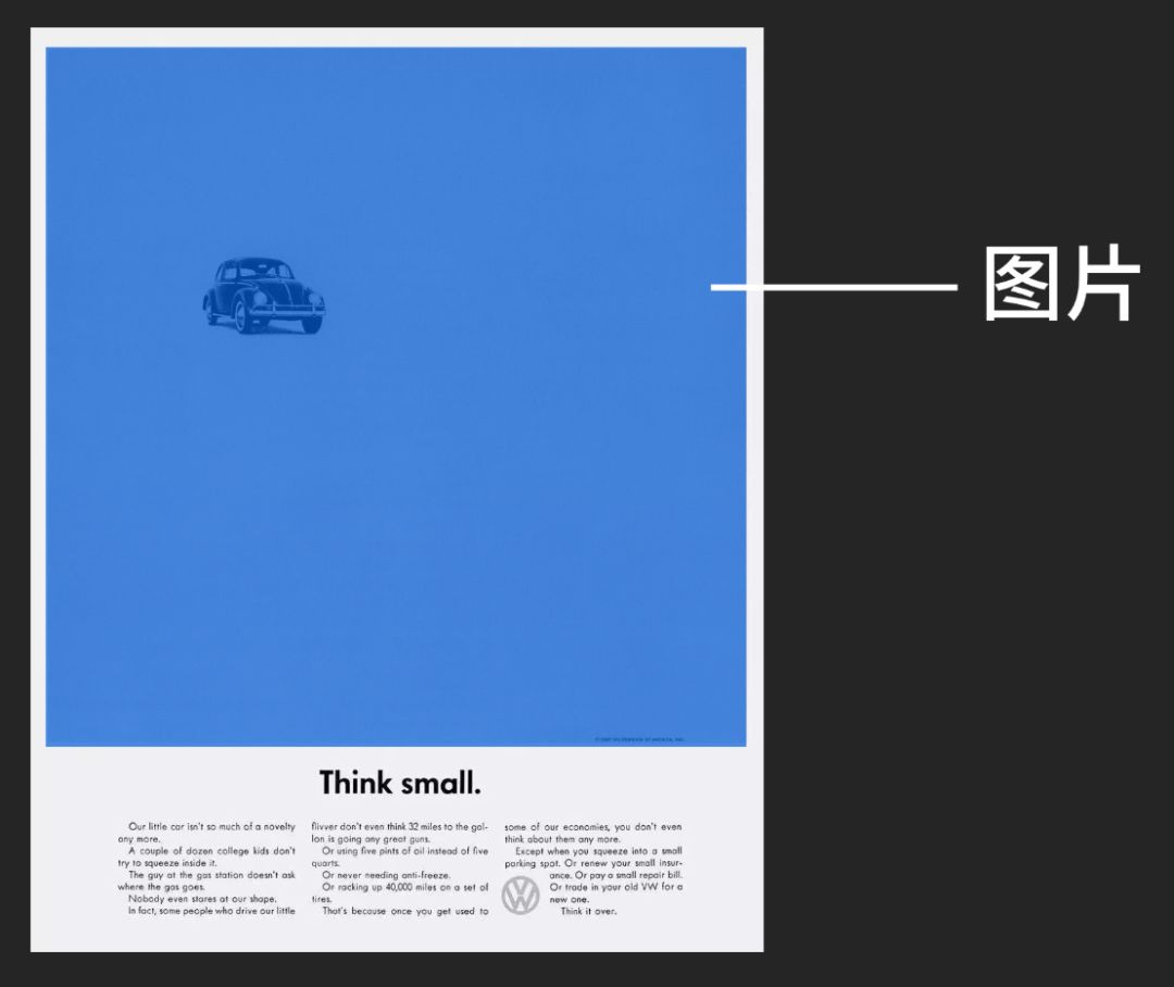 还有一种非常简练的构图,那是DDB公司在“创意革命”期间,定下的标准,一张大照片占据四分之三的页面,其次是标题下的图片,最后是正文和品牌标志。