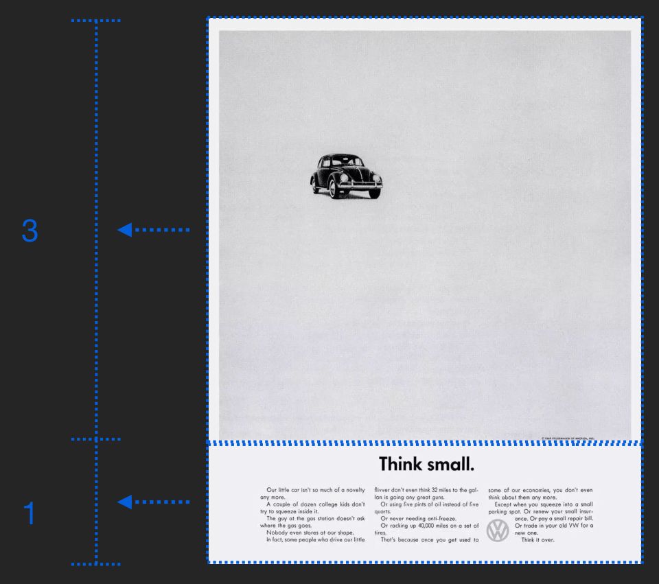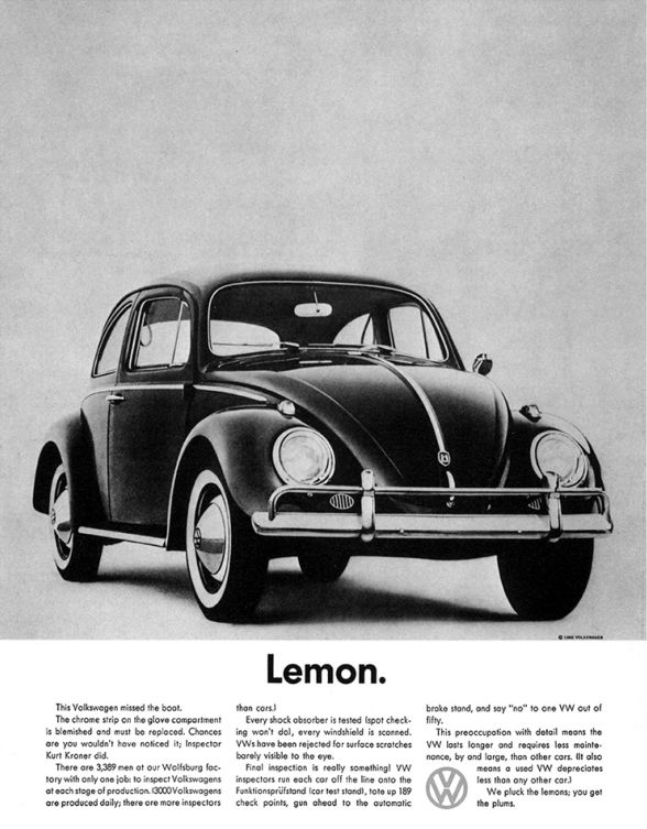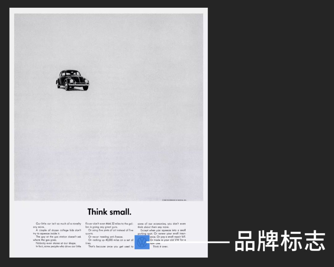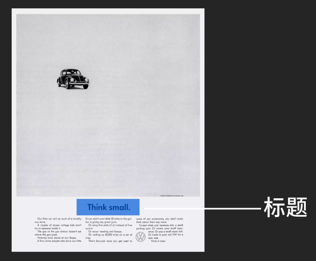 还有一种非常简练的构图,那是DDB公司在“创意革命”期间,定下的标准,一张大照片占据四分之三的页面,其次是标题下的图片,最后是正文和品牌标志。