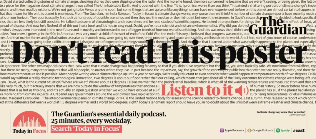 这个设计的广告标题翻译过来是,“不要读这张海报,听它”,重点是宣传《卫报》的每日新闻播客。所以这则广告选择用文字当主体而不是图像是最适合不过了。