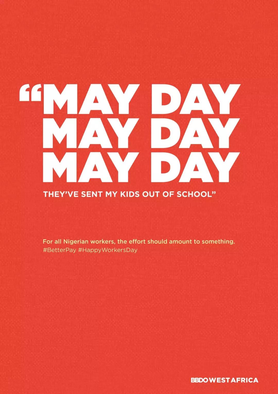这是BBDO给尼日利亚工人做的一张平面设计,由于当地部分州长没有能力支付工人工资,广告向政府说明普通工人的困境,他们应该得到更好的报酬和更高的生活水平。