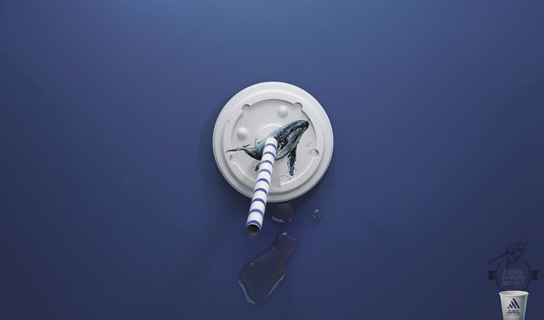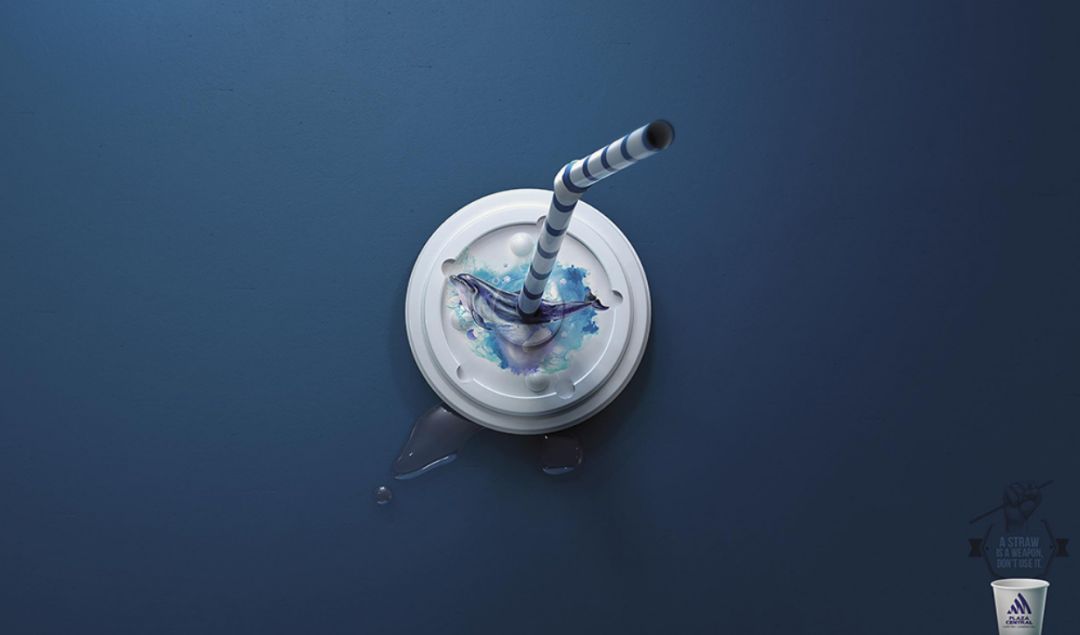 在这种结构中,标题和图像是分不开的。无论什么情况下,文字和图像都是紧密融合的。广告的画面是一支吸管直穿海洋生物,右下角英文意思是“吸管是武器,不要使用它”,呼吁消费者不要使用吸管。