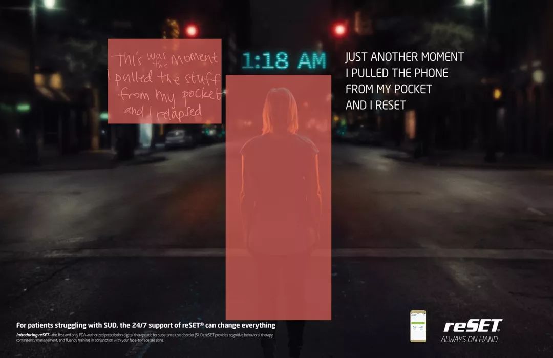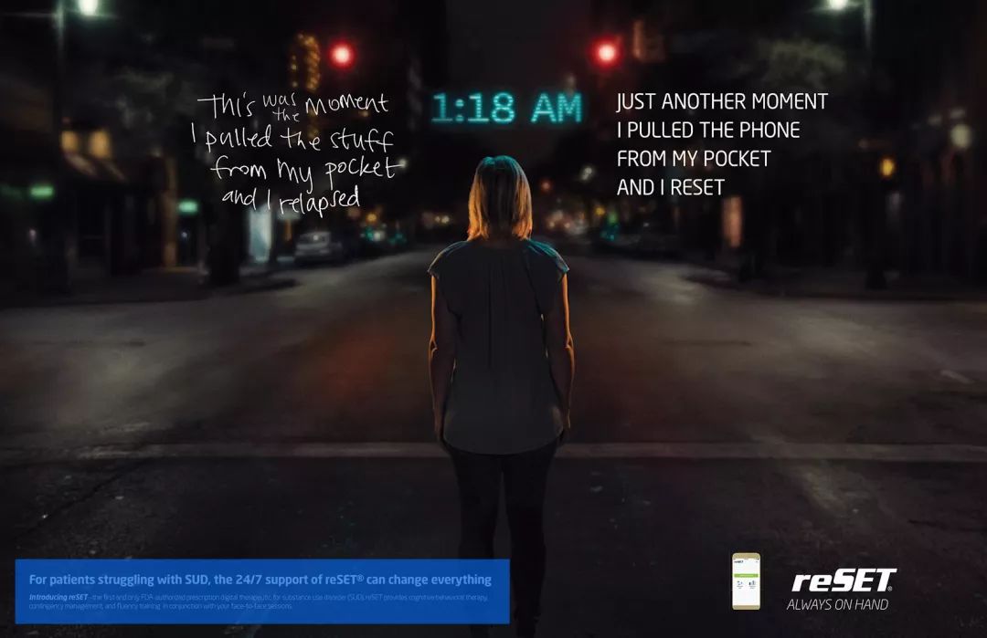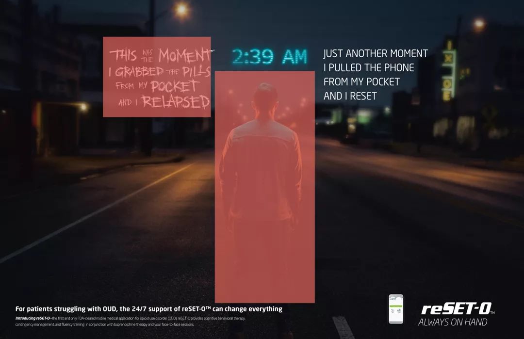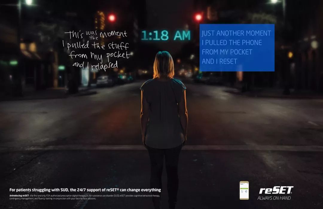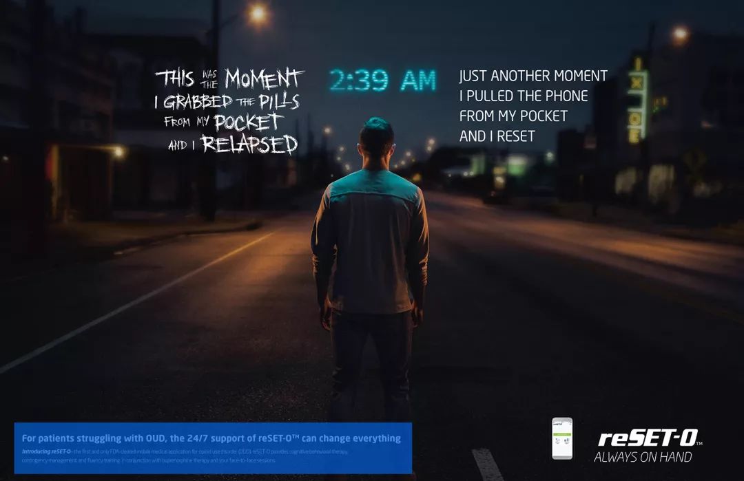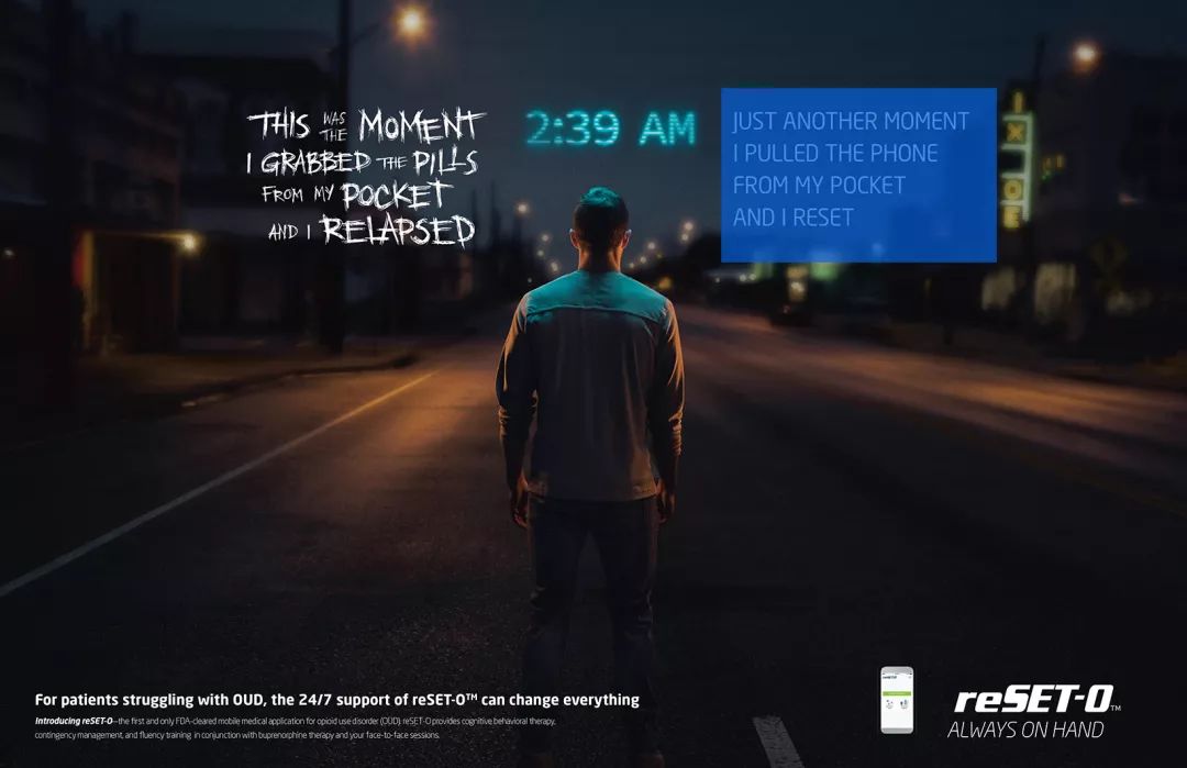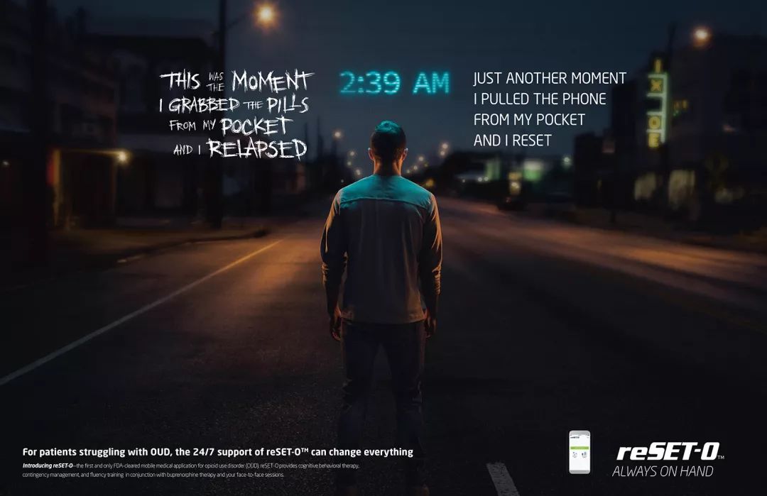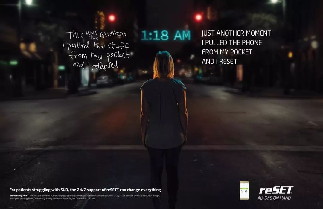 在象征性结构模式中,其余的所有元素都是从属于标题和主图像,它们之间的关系是不可分割的。例如这个广告,展示了reSET-O和reSET这两款数字治疗药物,全天候随时待命,治疗物质使用障碍者。