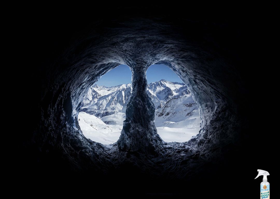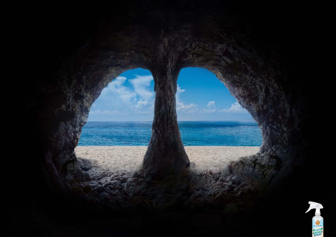 图像驱动结构的广告,只能使用一副图像来传达所有信息,而不使用任何文字。在没有标题的情况下,一幅图像潜在地承载了所有信息。比如说这个广告是传达贝西空气清新剂的卖点,吸入鼻中的感觉犹如在高山和海滩中。