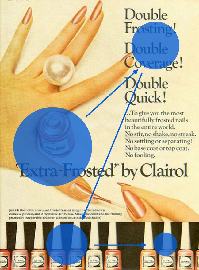 例如这则广告,我们目光先被标题和涂指甲油的手指吸引,紧接着目光被右边副标题牵制,然后对角移动,落在指甲油上,往右扫视。阅读流畅,主次分明。