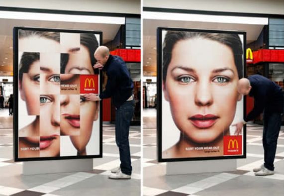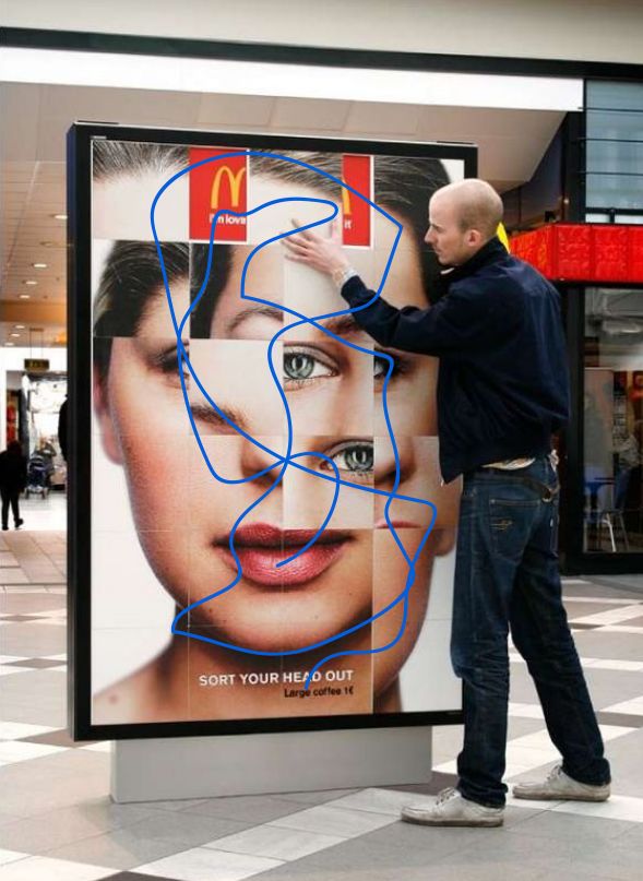 因为这个广告,想要传达的意思是,整理一下思绪,是为了推广麦当劳的大咖啡,售卖价格仅要1欧元,广告被分成了30个可以移动的板块,给路过的消费者互动,推送拼图。