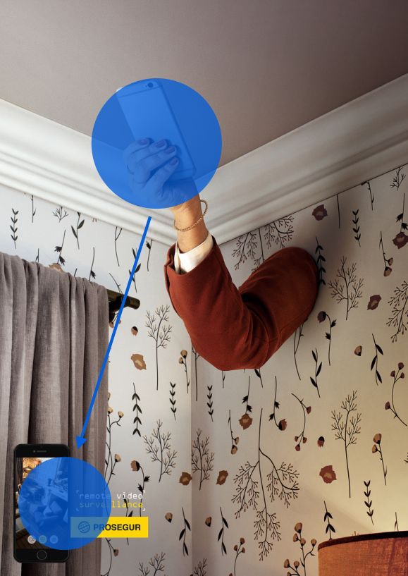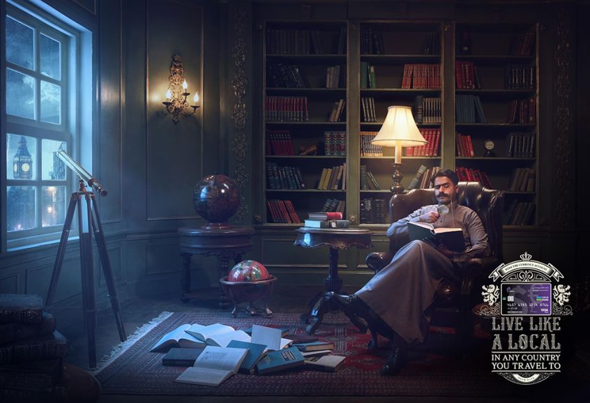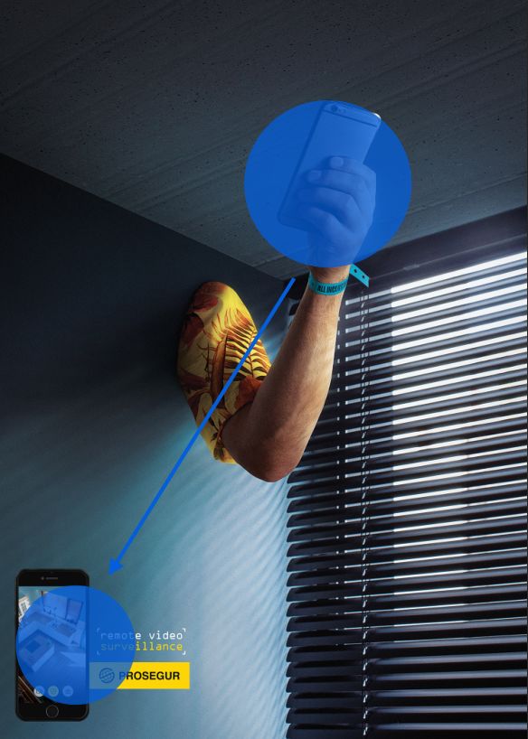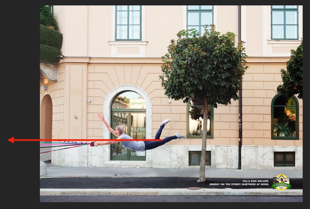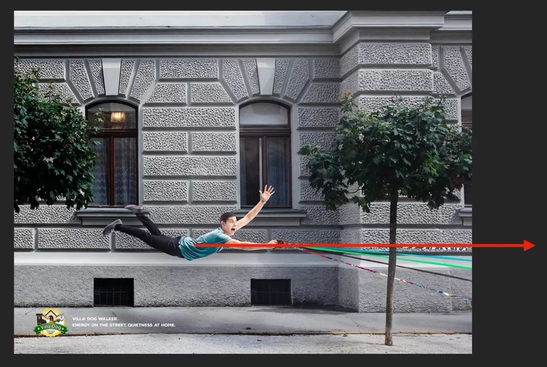 这个广告通过构图来营造一种假堕落的感觉,透过透视也能产生一种运动的假象,引导我们视线从人物纵深往灭点移动。