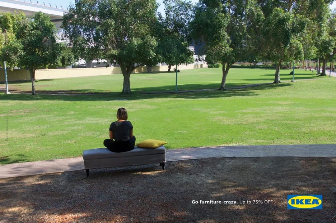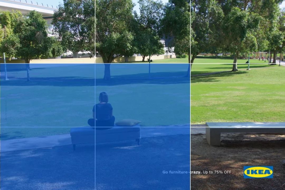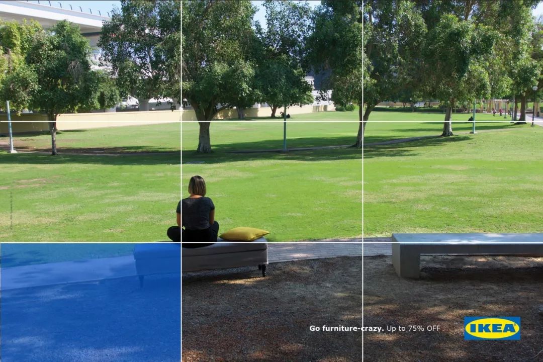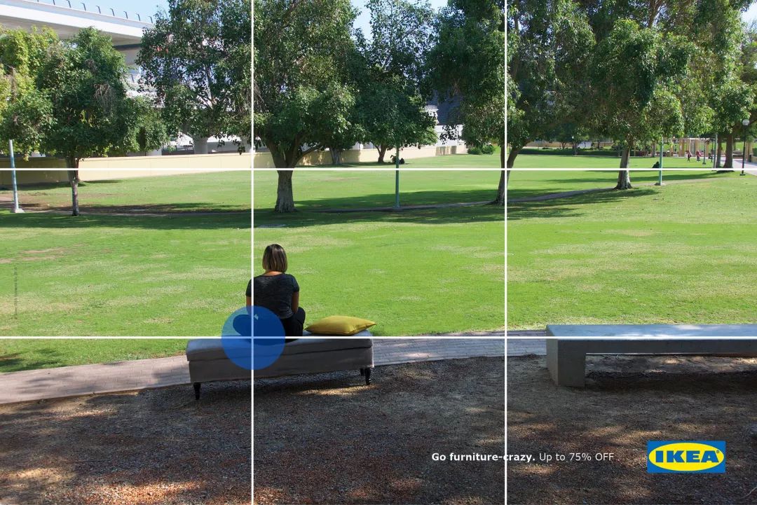 研究表明,当观看图像时,人们的视线的落脚点通常是最自然的,不是照片的中心,而是其中一个交叉点。这种构图我们能第一眼辨识到主体,注意力瞬间被她抓住,仔细看这张宜家广告,沙发和模特都在趣味点上,石凳,树木都沿着这些线。