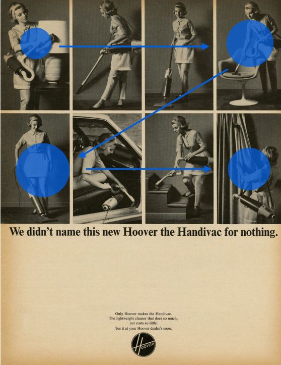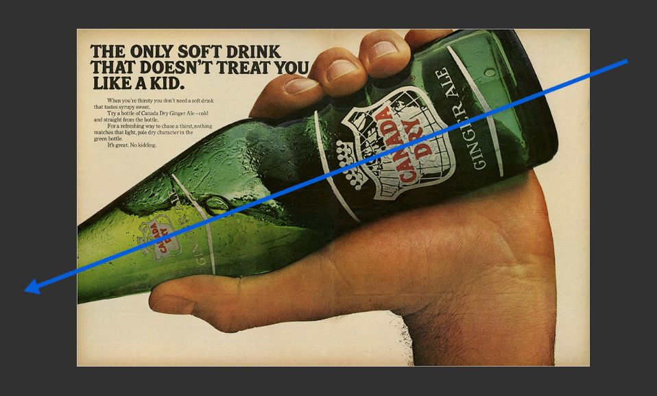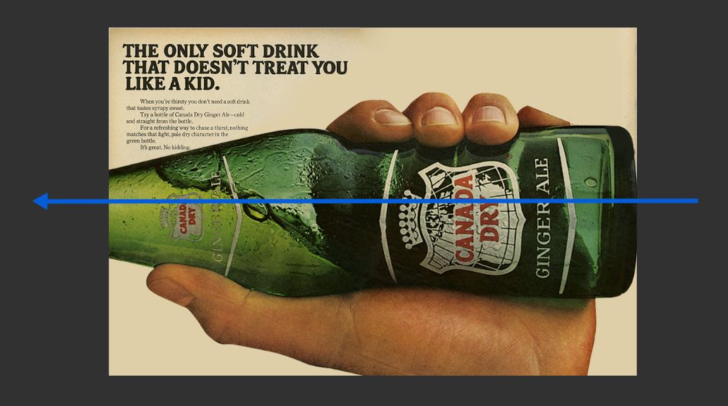 搞清了图片和文字的关系,那我们就可以入主题了,人们看静态广告时,都会先找构图切入点,也就是广告的焦点,通常是占主导地位的图像,因为研究表明,切入点使用文字或标题相比,人们更喜欢图像。