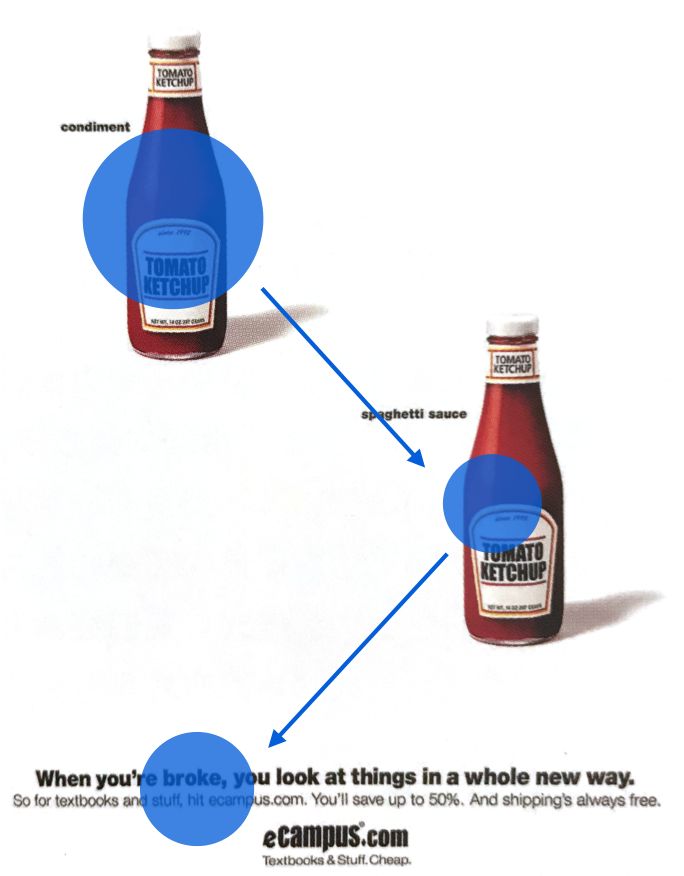 同样的道理,我们的目光从左上角的番茄瓶对角移动到右下角,然后移动到底部的文案,形成一个字母V。