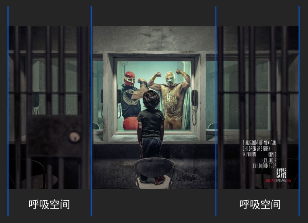 我们再往下看,这张广告使用的是居中构图,这种构图存在着垂直方向的平衡,我把这称做“呼吸空间”。