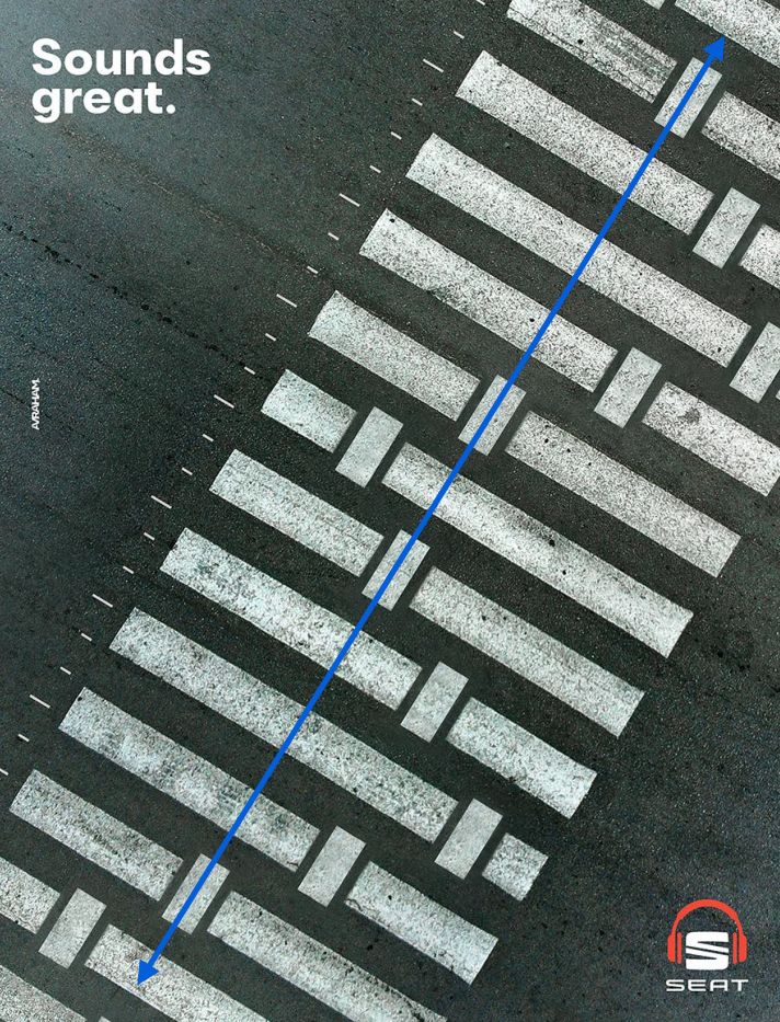 直线型对角线构图有把画面 “劈开”,一分为二的气势,例如这张广告,音量混合器叠在马路上, 有种把画面劈开的错觉,这个平面广告的目的是通过“节拍”音响系统,传达SEAT汽车品牌的音响,听起来不错。