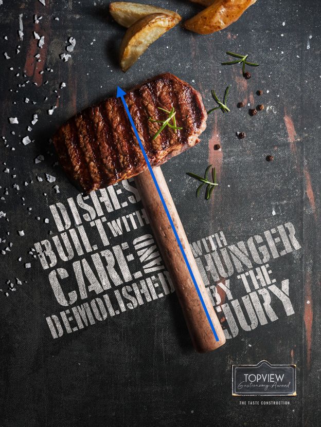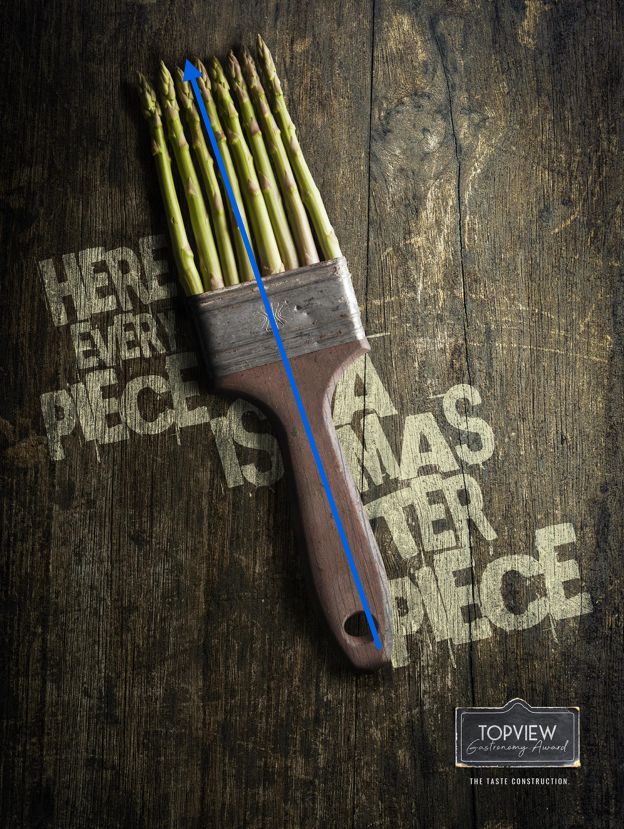 如图,引导线都在画面中间,并没有沿着对角线一直展开到画面两端。这是美食奖的广告活动,主要表达一个好厨师必须像建筑师一样创造。