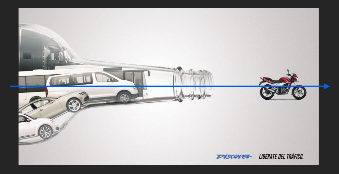 这个运动在画面中产生一条线、主弧、角度或缠绕活动,以指引观看者的视线,并将所有的元素结合在一起。例如这个广告,“从交通中解脱”。