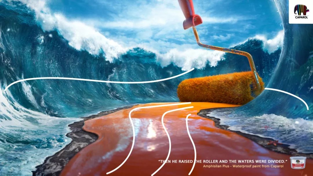 把这样一个曲线元素融入到你的作品里,可以在画面中营造出漂亮动感和韵律感。例如这个防水涂料广告,举起滚轮,水就被分开了。这个画面它完全可以向前划出一条直线,也能赋予上这个卖点,但它选择了曲线,转了个小弯。