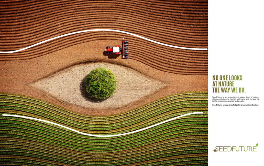这个广告也存在柔美的曲线,再配上右边低版面率的排版,给人成熟稳重,有格调的感觉,和广告要传达的意思不谋而合,广告推广的是SeedFuture这个生态系统,是一个由自然界诞生的价值生态系统,为环境,动物和人类生活的提供解决方案。