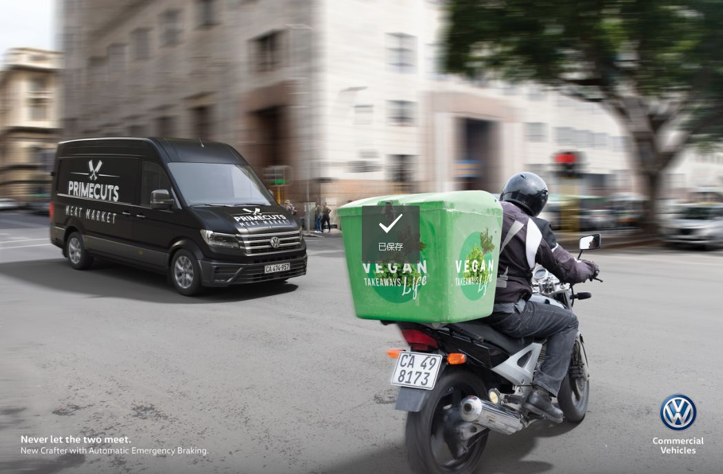 动态错觉具有新奇性、迷惑性,视觉传达设计中对于动态错觉的合理利用,可以吸引受众的注意力,激发观者的好奇心,这个广告“永远不要让他们相遇”,画面动态模糊处理过的背景,极度的靠近的两主体赋予了画面张力感,给人视觉上造成了动态的错觉。这个广告宣传的是新Crafter自动紧急制动功能。