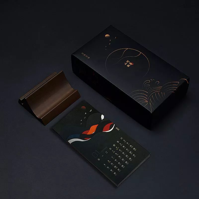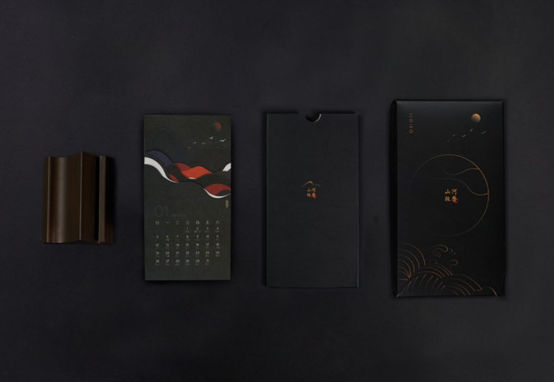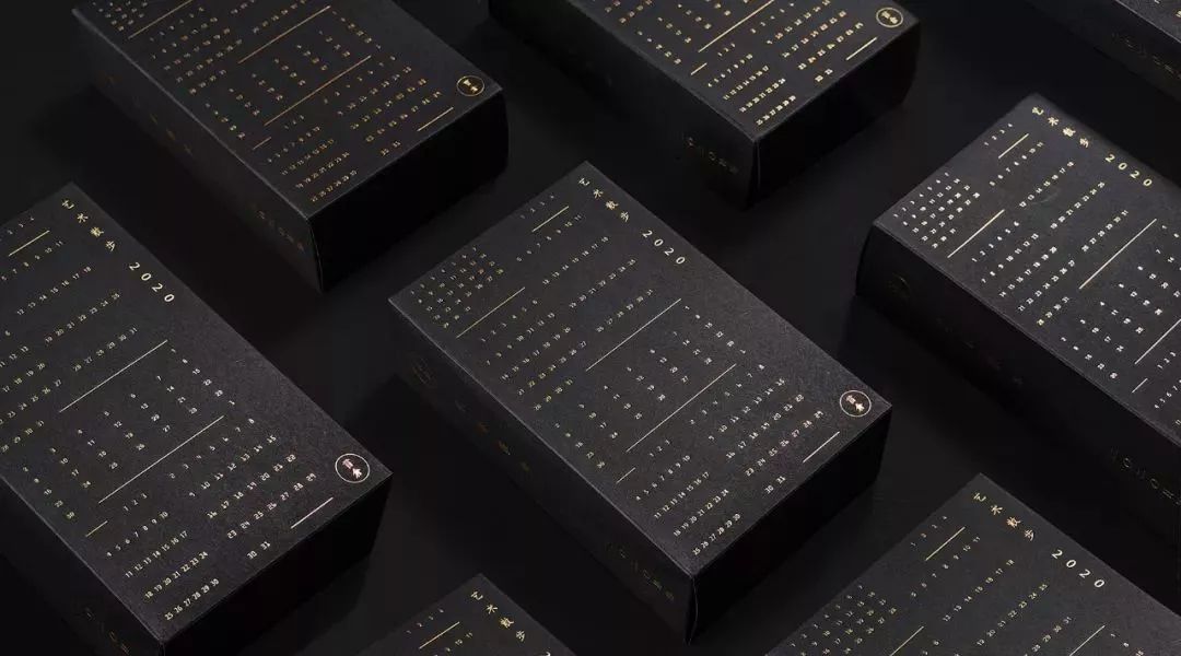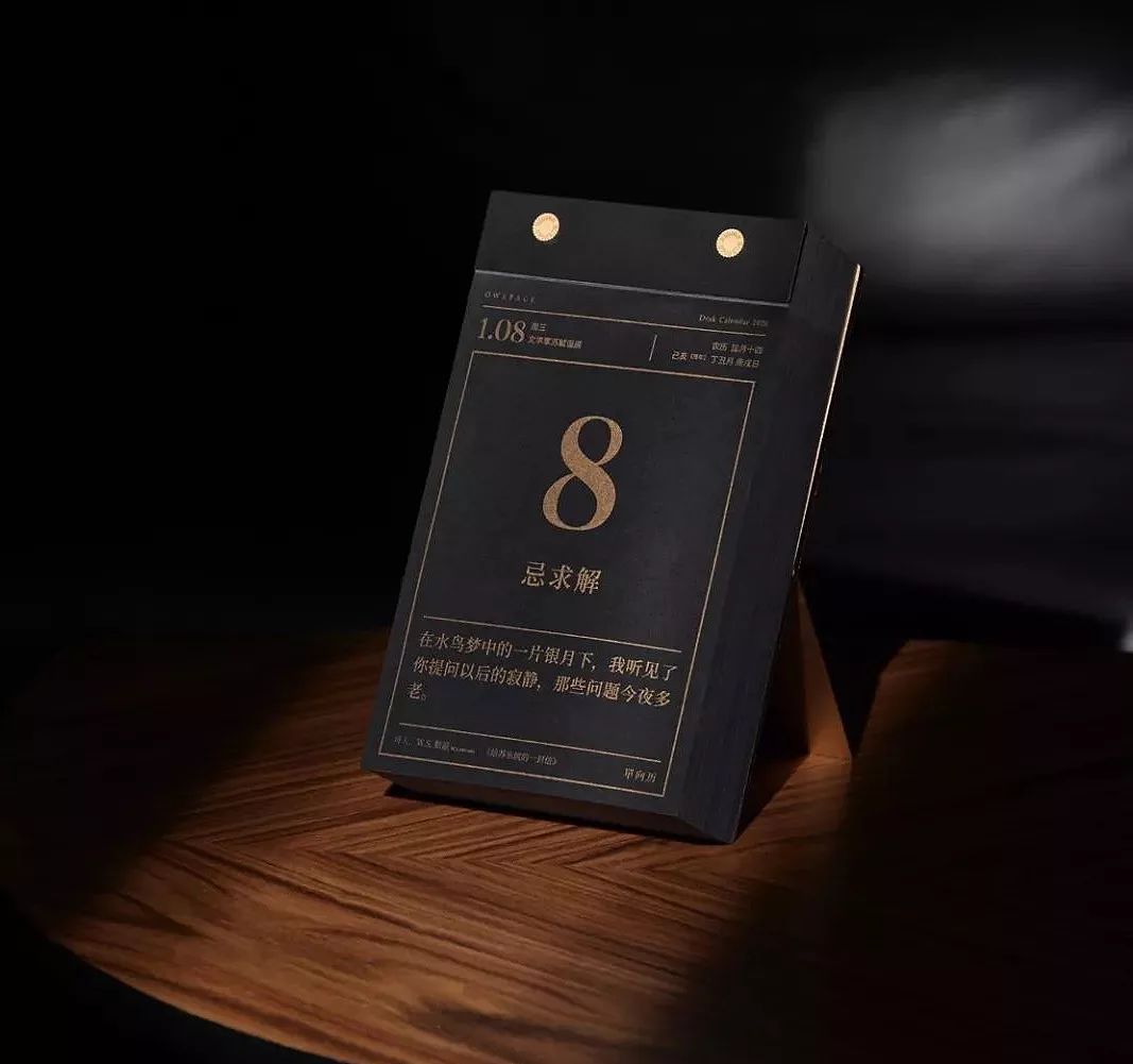 单向历 2020 黑金版在黑色纸上印金,采用金属铆钉、可活动金属支架,呈现一日交接、午夜降临时的颜色。