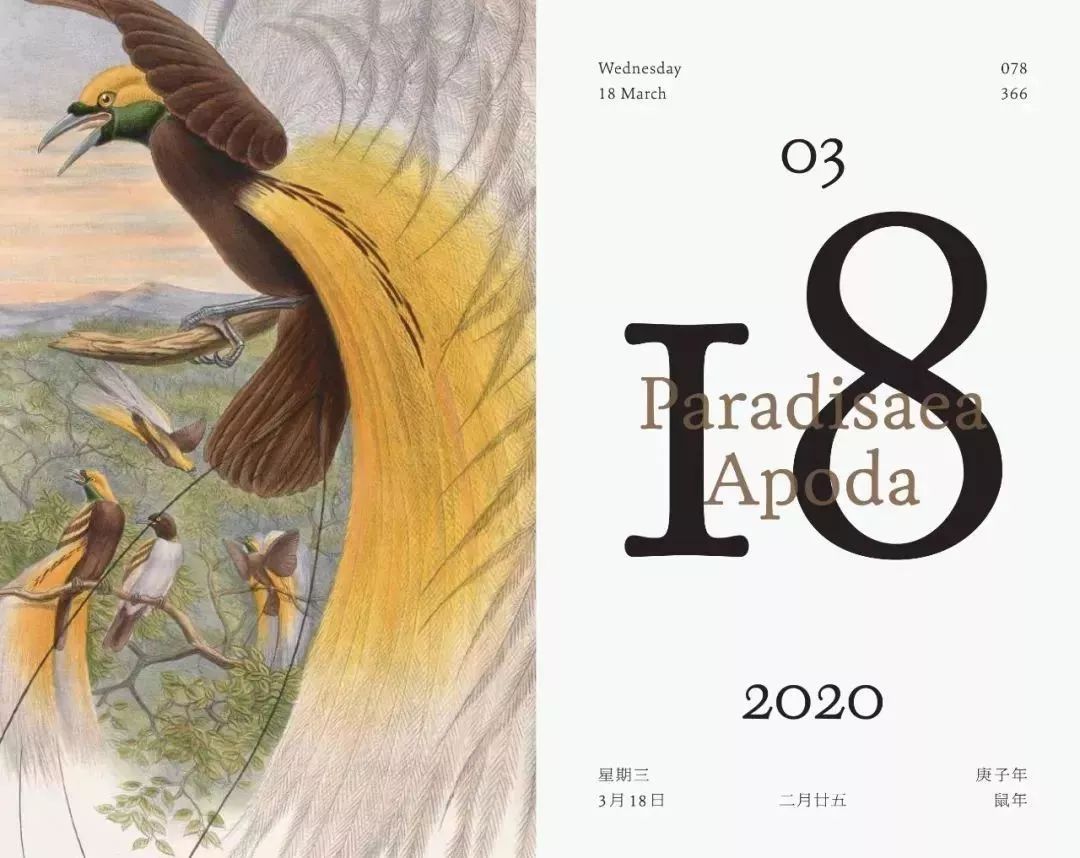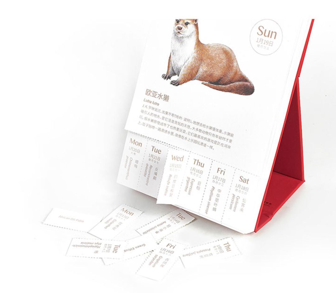 果壳网的物种日历自2015年问世以来,一直是日历热门。2020以“故事”为主题,53张插画,366张物种“身份证”,与大家探讨自然万物与人类的微妙关系,比如每周日,都会迎来全新的物种和它背后的有趣故事,由此开启新的一周。