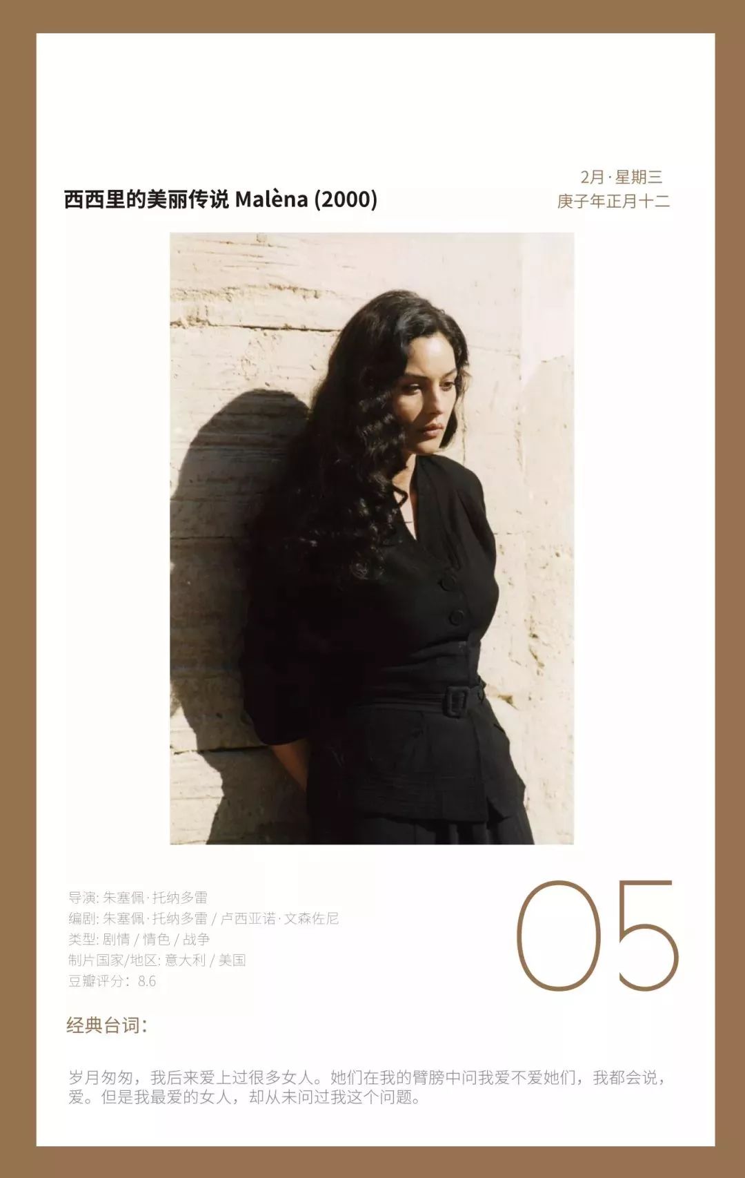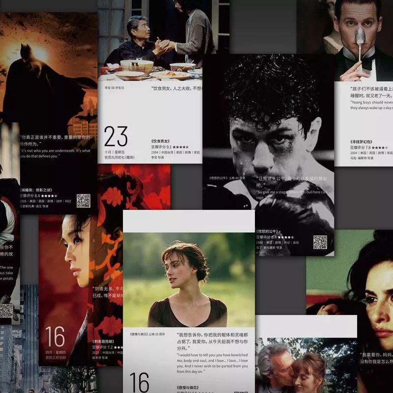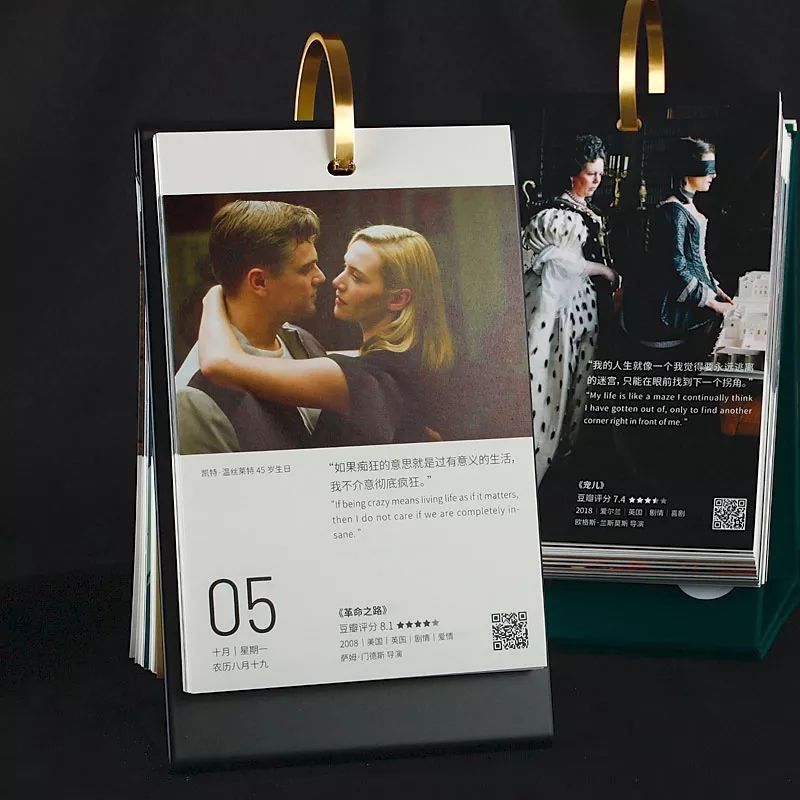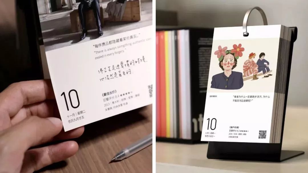 豆瓣电影日历的设计一如往年,每日推荐一部豆瓣高分电影并搭配经典台词,343幅正版授权电影剧照与23幅原创手绘插画。但今年新增了全幅海报设计,其中有不少18、19年上映的口碑佳作。