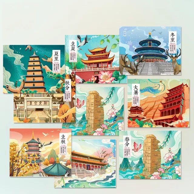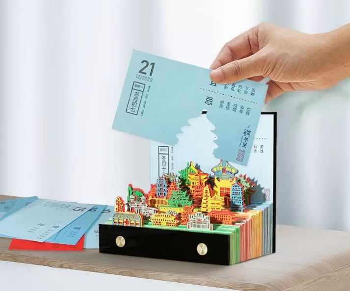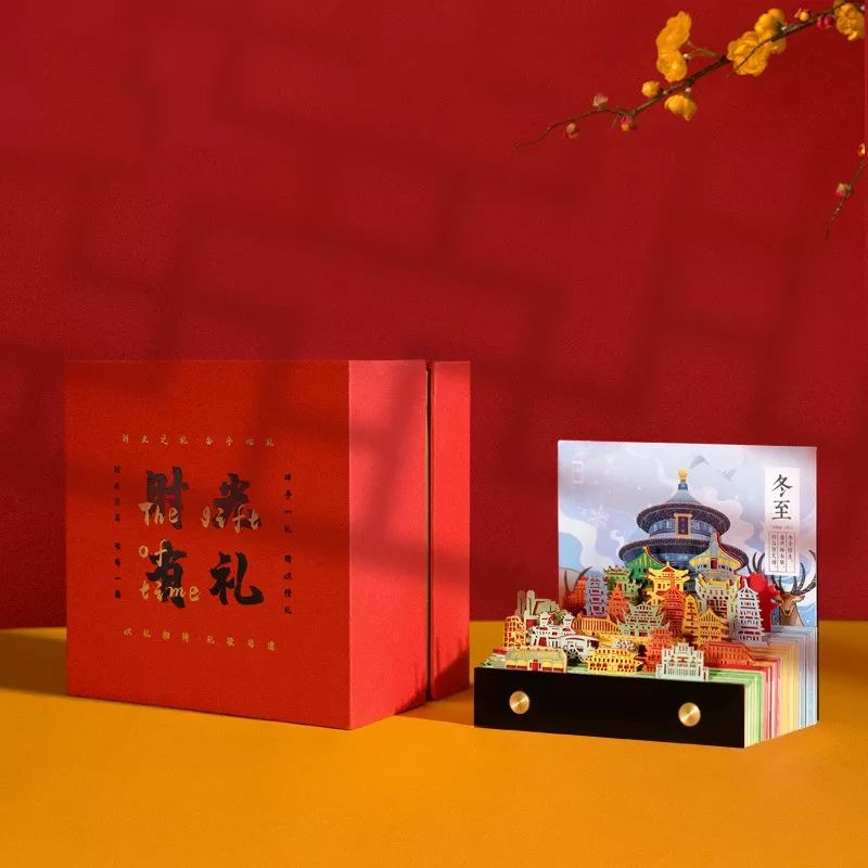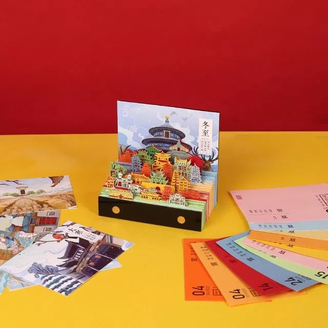 由顺历文创、插画师、非遗传承人等近100人团队,近286天精心设计而成。灵感来源中国二十四节气与24座礼制古建筑,用纸雕建筑记录时间,希望每个人能做到时间的收礼者。