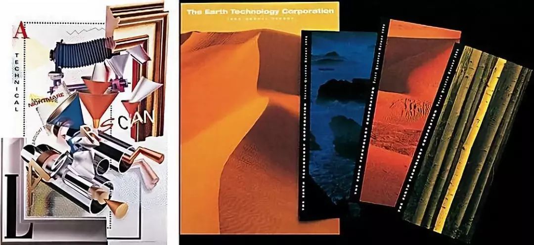 △左:Laserscan海报,1988年,设计师:Thomas Wedell/Nancy Skolos,摄影师:Thomas Wedell/Kenneth Raynor;设计公司:Skolos,Wedell+Raynor。右:地球技术公司年报,1994年,设计师:Lana Rigsby/Troy S. Ford;文字作者:JoAnn Stone;摄影师:Gary Faye;设计公司:Rigsby Design。