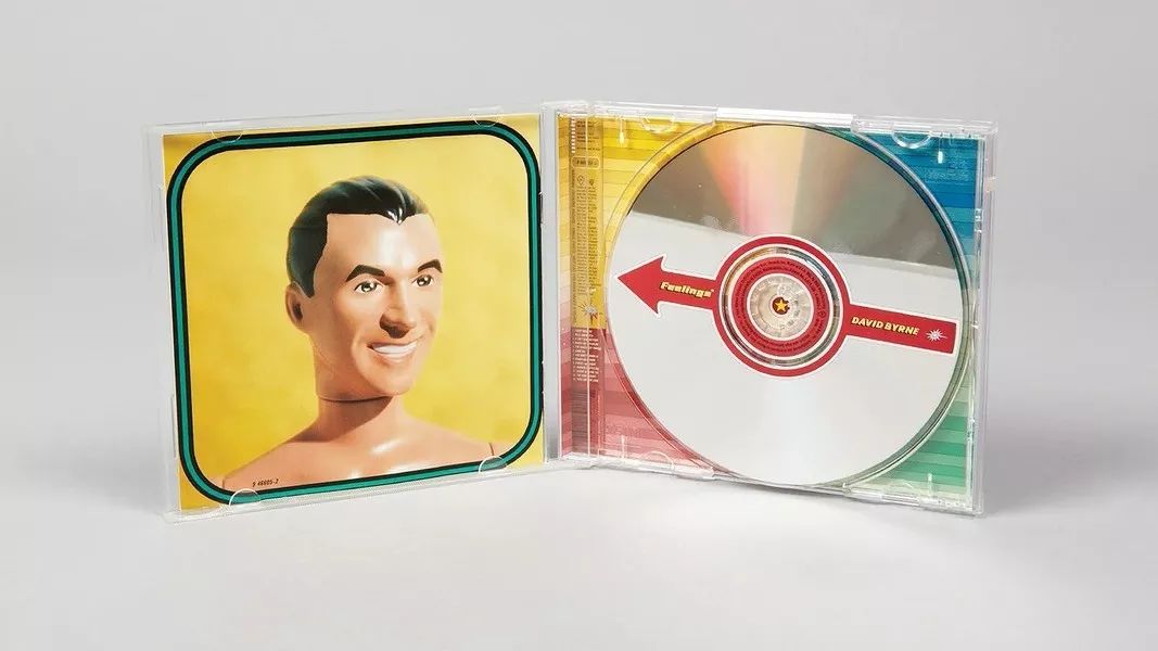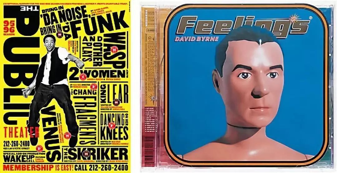 △左:公共剧院海报,1995年,设计师:Lisa Mazur/Paula Scher;设计公司:Pentagram。右:大卫伯恩“Feelings”CD包装,1996年,艺术总监:Stefan Sagmeister;设计师:Stefan Sagmeister/Hjalti Karlsson;文字作者:David Byrne;摄影师:Tom Schierlitz;模型制作:Yuji Yoshimoto;设计公司:Sagmeister Inc.。