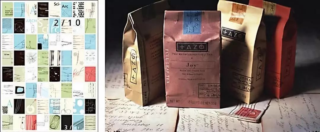 △左:Sci-Arc新兴声音系列讲座海报,1999年,艺术总监/设计师:Jennifer Sterling;文字作者:Margi Reeves;插画师:Jennifer Sterling/Amy Hayson;设计公司:Jennifer Sterling设计。右:Tazo茶包装,2001年,设计师/艺术总监:Steve Sandstrom;文字作者:Steve Sandoz;设计公司:Sandstrom Design。