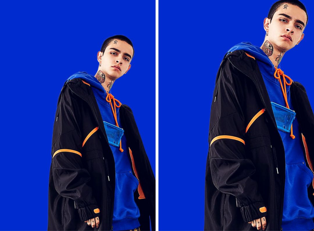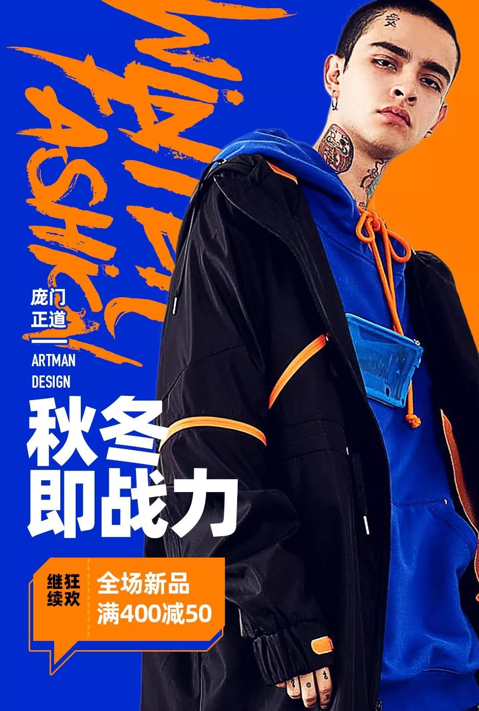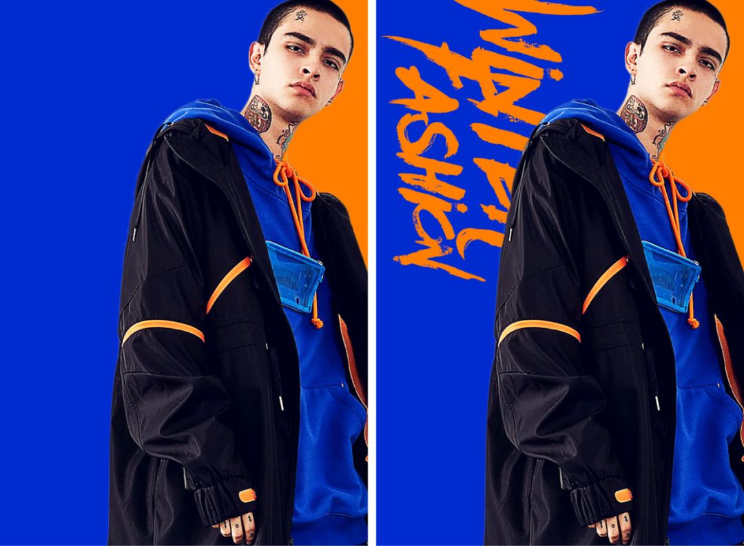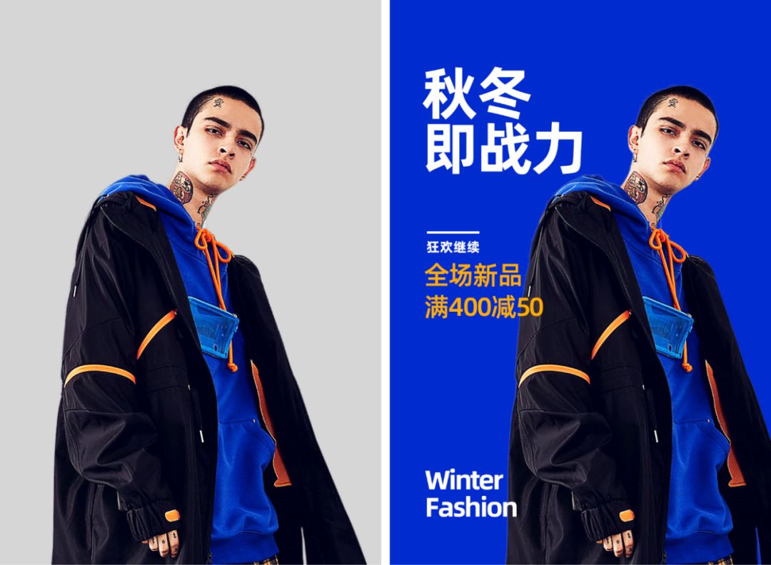 下面这个男装广告,按照常规思路我们抠好图之后,然后选好合适的背景色,再把文字按步就班的排版好,一个基本及格的广告就做好了。