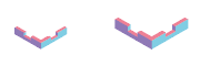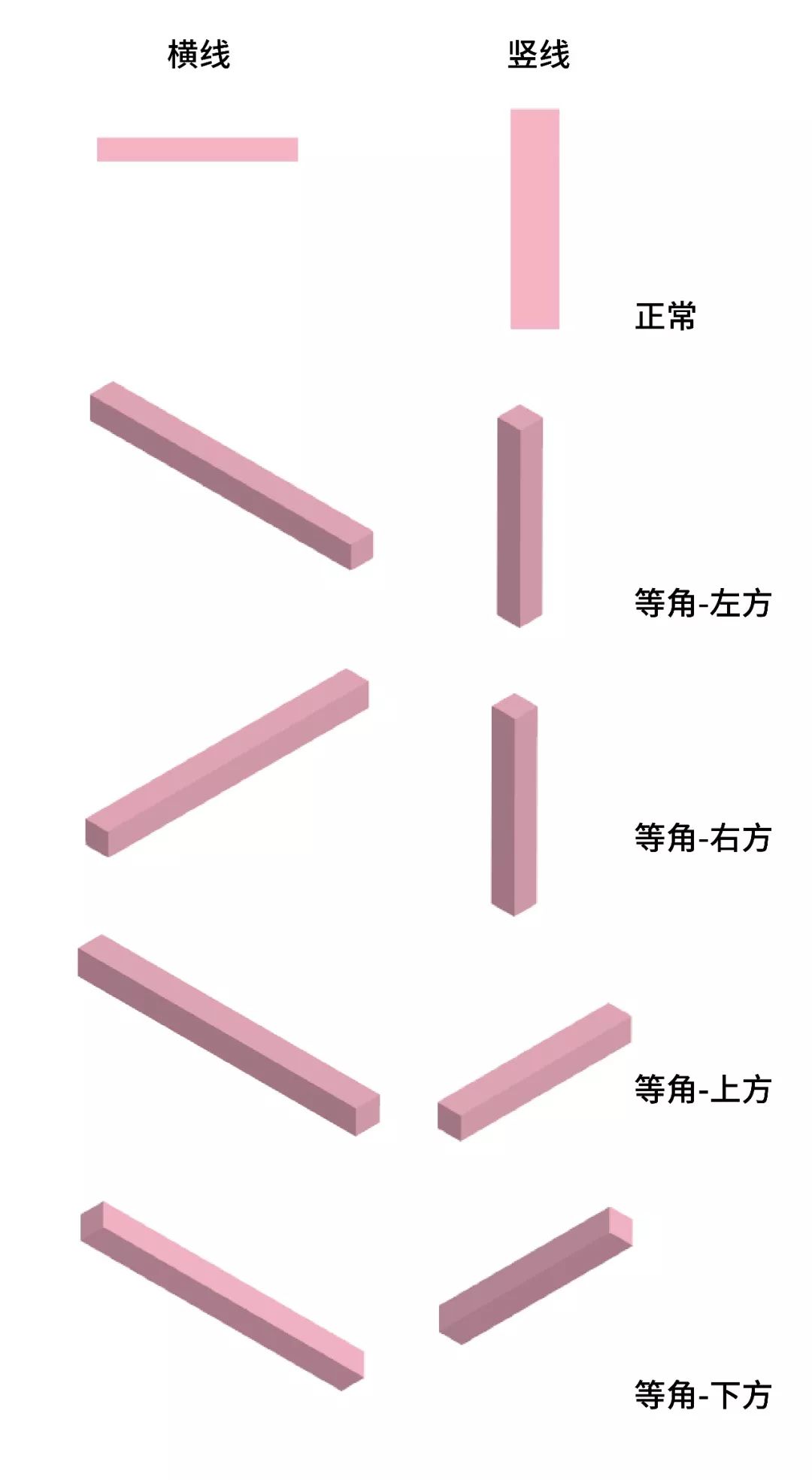 直线在四个方向的立体化,就会发现“上方”和“下方”的倾斜角度是一样的,所以除去特殊情况,我们就用“左方”和“右方”两个工具就足够了。