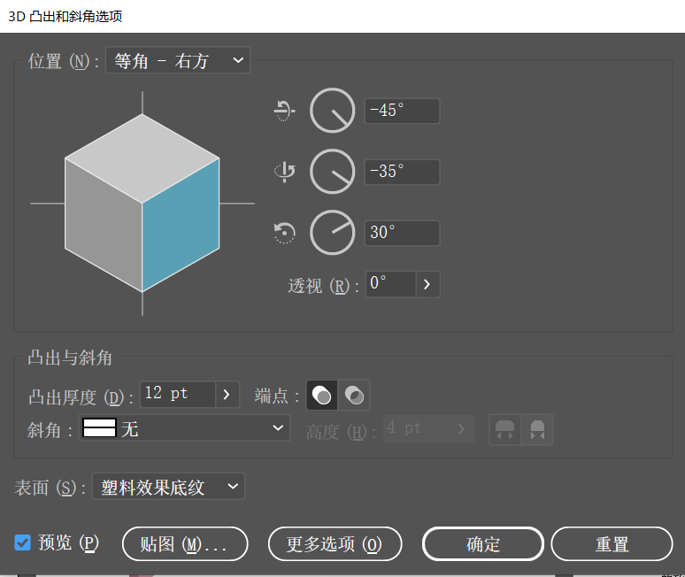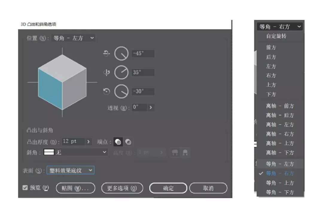 主要运用钢笔工具和3D工具里的凸出和斜角,那么在凸出和斜角中你会发现有很多选项,其中大部分都用不到,常用的是等角。因为等角的立体角度是一样的,省去很多不必要的功夫。