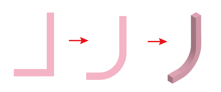 有弧度的笔画在平面阶段要把直角做圆角处理,“直接选择工具”中有圆角工具。适当地拉弧度。