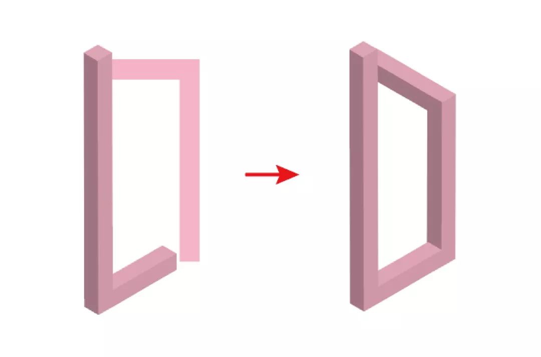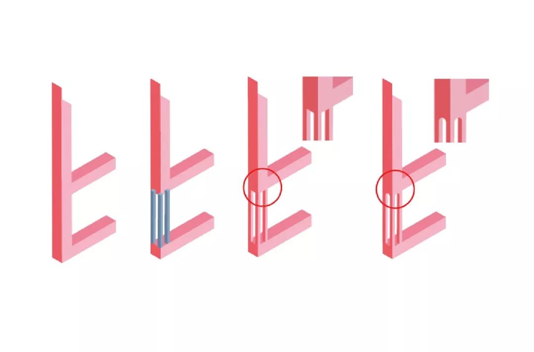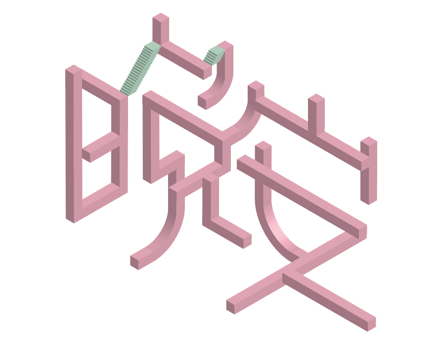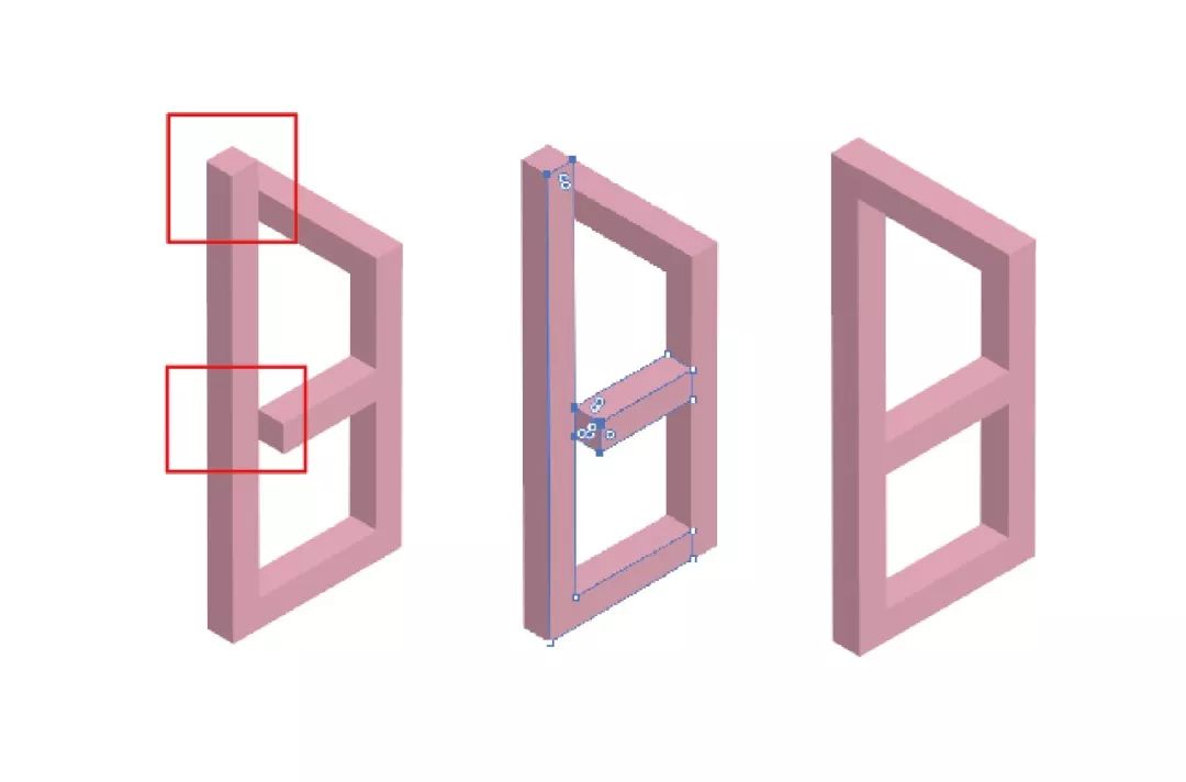 “日”字旁我想要一个类似“亭子”的效果。首先需要3根“柱子”,“柱子”的描边宽度和凸出厚度都是3pt,长度能够顶住上下两部分。之后扩展,然后把“日”字被替换部分截去,把柱子安进去。最后把在一个面的图形合并,合并的命令在“窗口”>“路径查找器”第一个。之后还要给“柱子”顶部做一下圆角。因为有透视,所以近处的圆角比远处的要大一点。