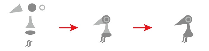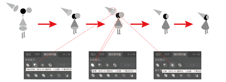 开始做细化的处理。我想要的是矛盾空间,那么红框的部分就需 要结合到一起。用直接选择工具拖动要被盖住部分的锚点,直到看不见凸出为止。其他相似位置操作也一样。