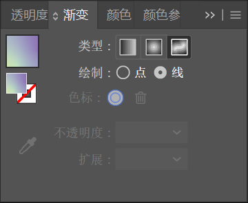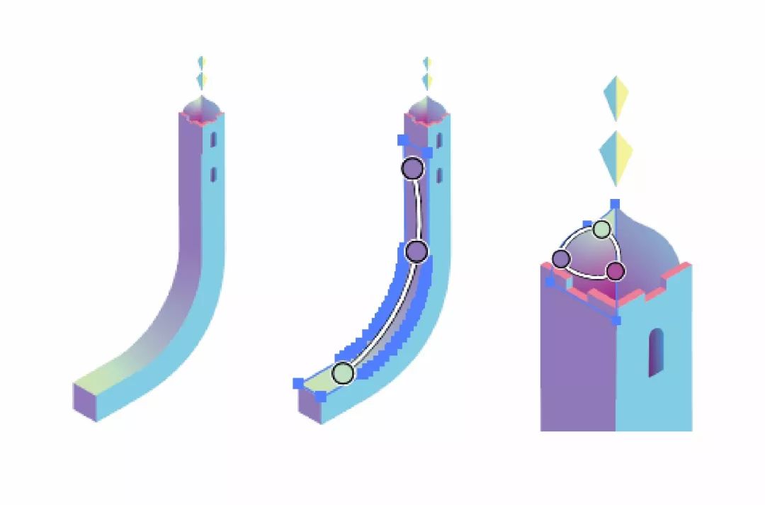 这里几个有弧度的需要用到颜色渐变,AICC2019中渐变有个非常好用的功能“任意形状渐变”,可以自由地布置渐变的路线。