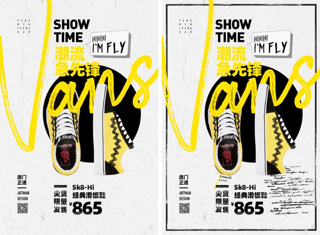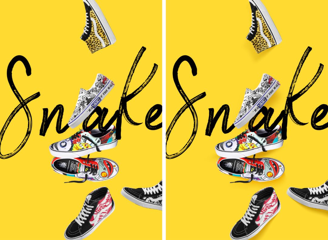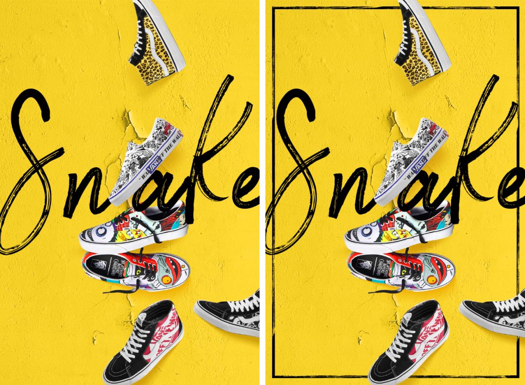 选一个涂鸦风格的英文字体打上品牌的名字,然后与鞋子做一点穿插的效果。这样整个版式在视觉上就形成了很强烈的动态变化。