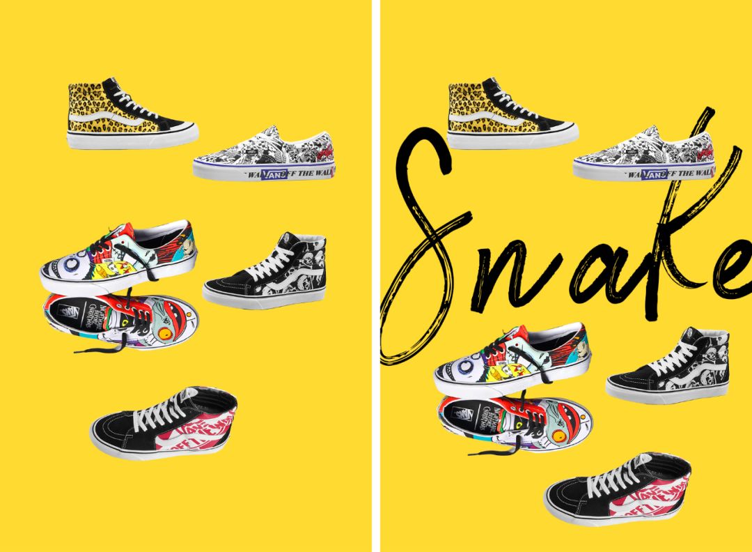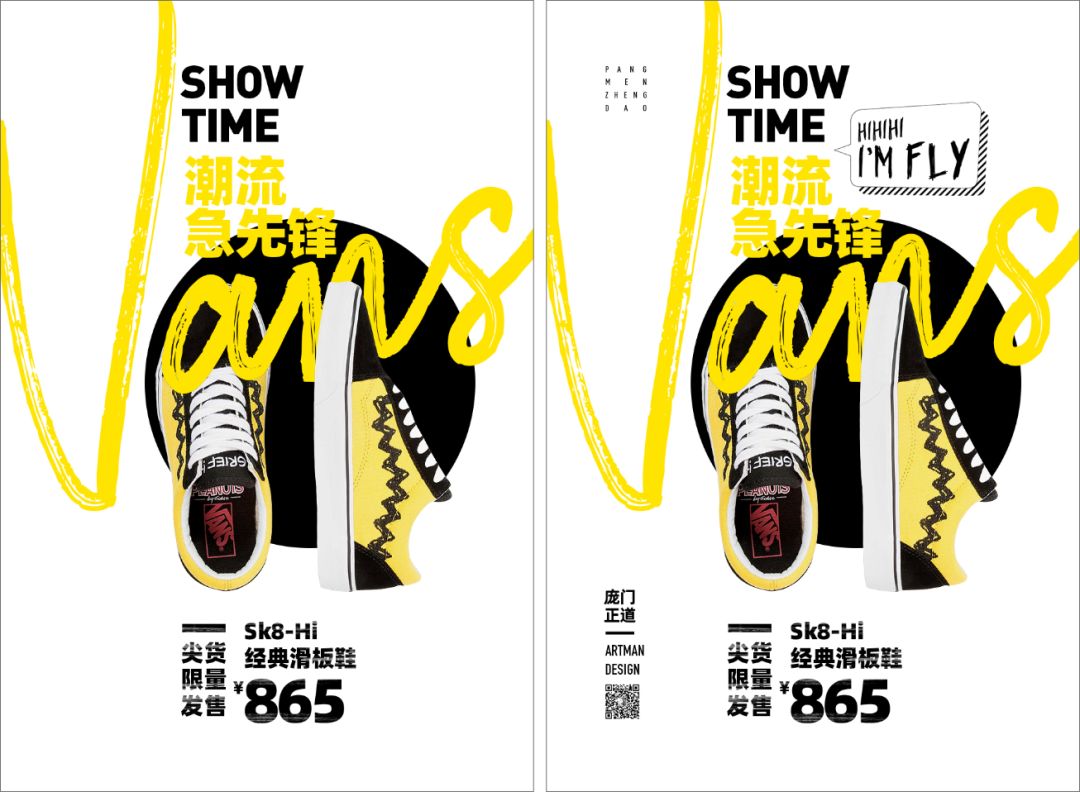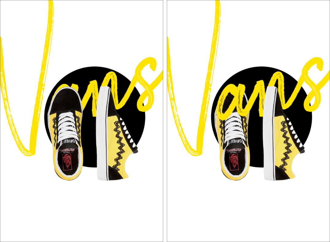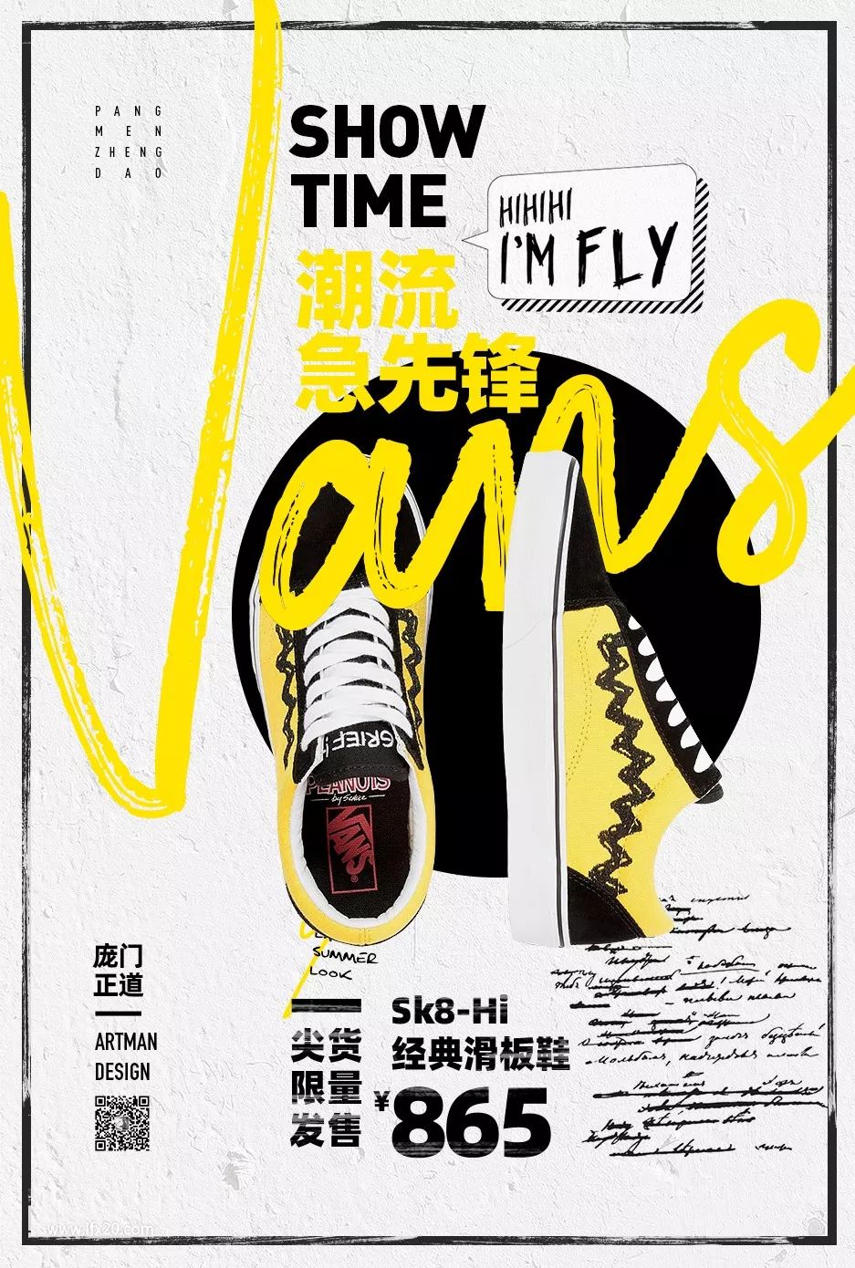 选一个涂鸦风格的英文字体打上品牌的名字,然后与鞋子做一点穿插的效果。这样整个版式在视觉上就形成了很强烈的动态变化。