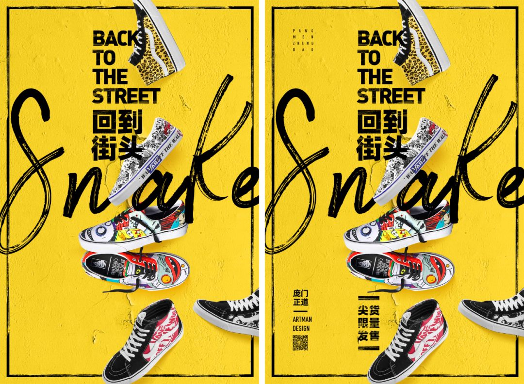 首先抠一双某潮牌的鞋子,为了让它更突出,我在它的下面加了一个黑块,这样就形成了一个聚焦的点。