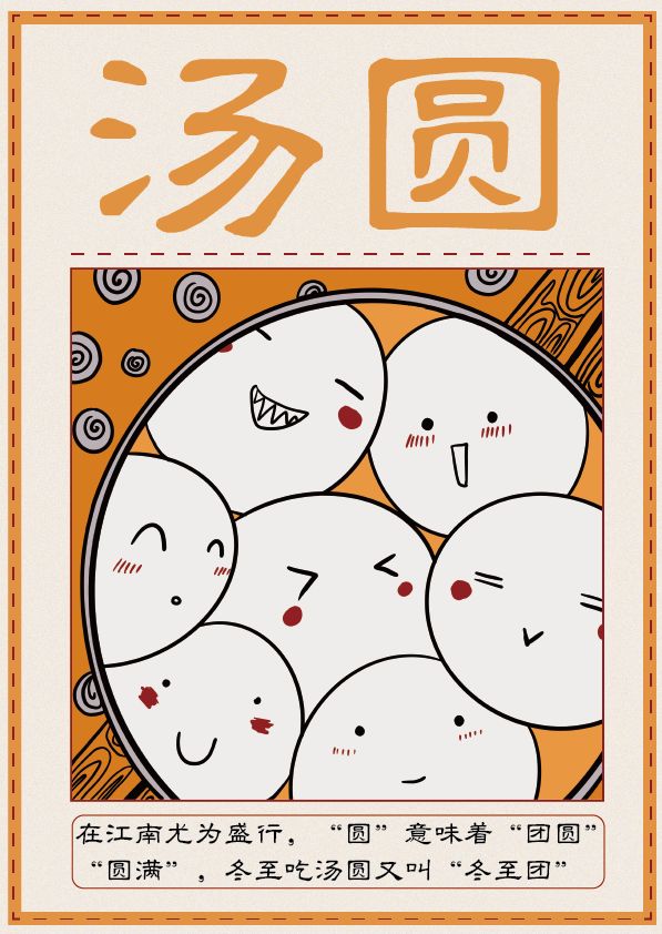 在南方一些地区到了冬至这一天比较盛行吃冬至团(冬至丸),取其团圆的意思。每逢冬至清晨,各家各户磨糯米粉,并用糖、肉、菜、果、萝卜丝等做馅,包成冬至团,不但自家人吃,也会赠送亲友以表祝福之意。